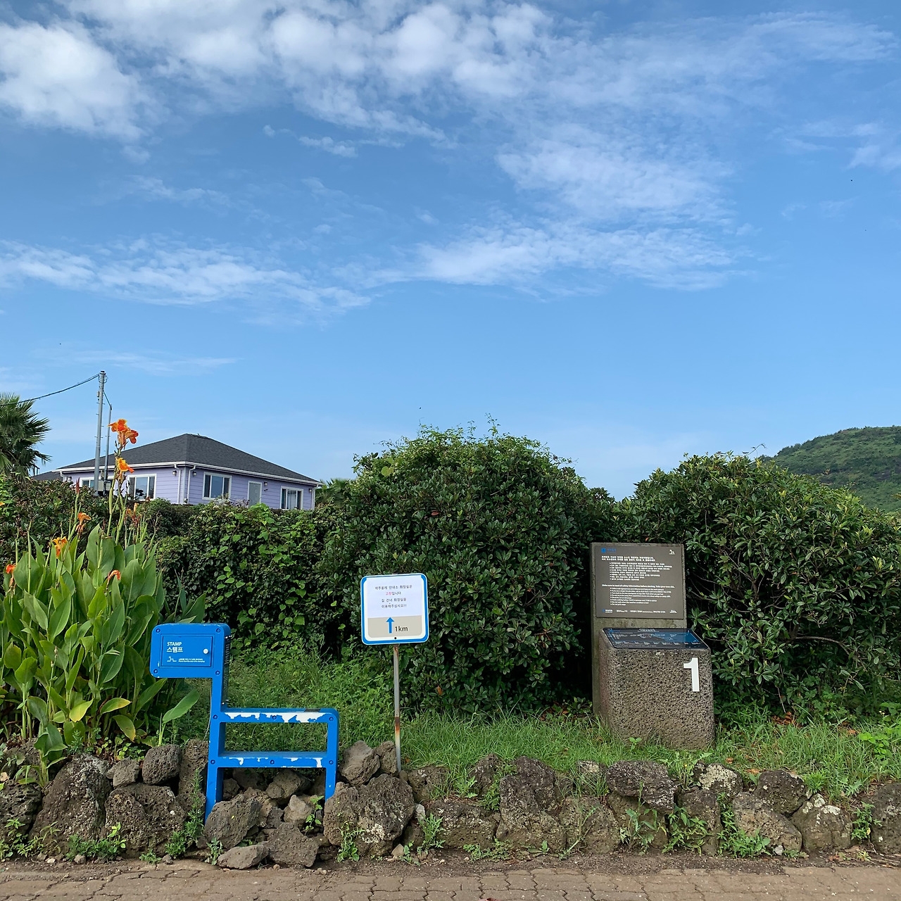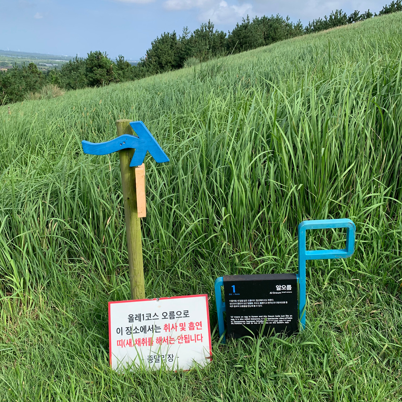 1코스는 시흥초등학교에서 시작해 광치기 해변까지 걷는 코스였다. 거리는 총 15km. 걸으며 말미오름과 알오름을 지나고 종달리 소금밭을 거쳐 광치기 해변에 이르면 끝이다. 제주에 몇 번 왔어도 오름을 제대로 맛본 기억이 없어 더 기대가 되는 코스였다. 그런데 이거 어디로 올라 가야 하는건지. 푯말앞에서 한참을 쭈뼛거리다가 결국 주변에 물어 길을 찾았다.