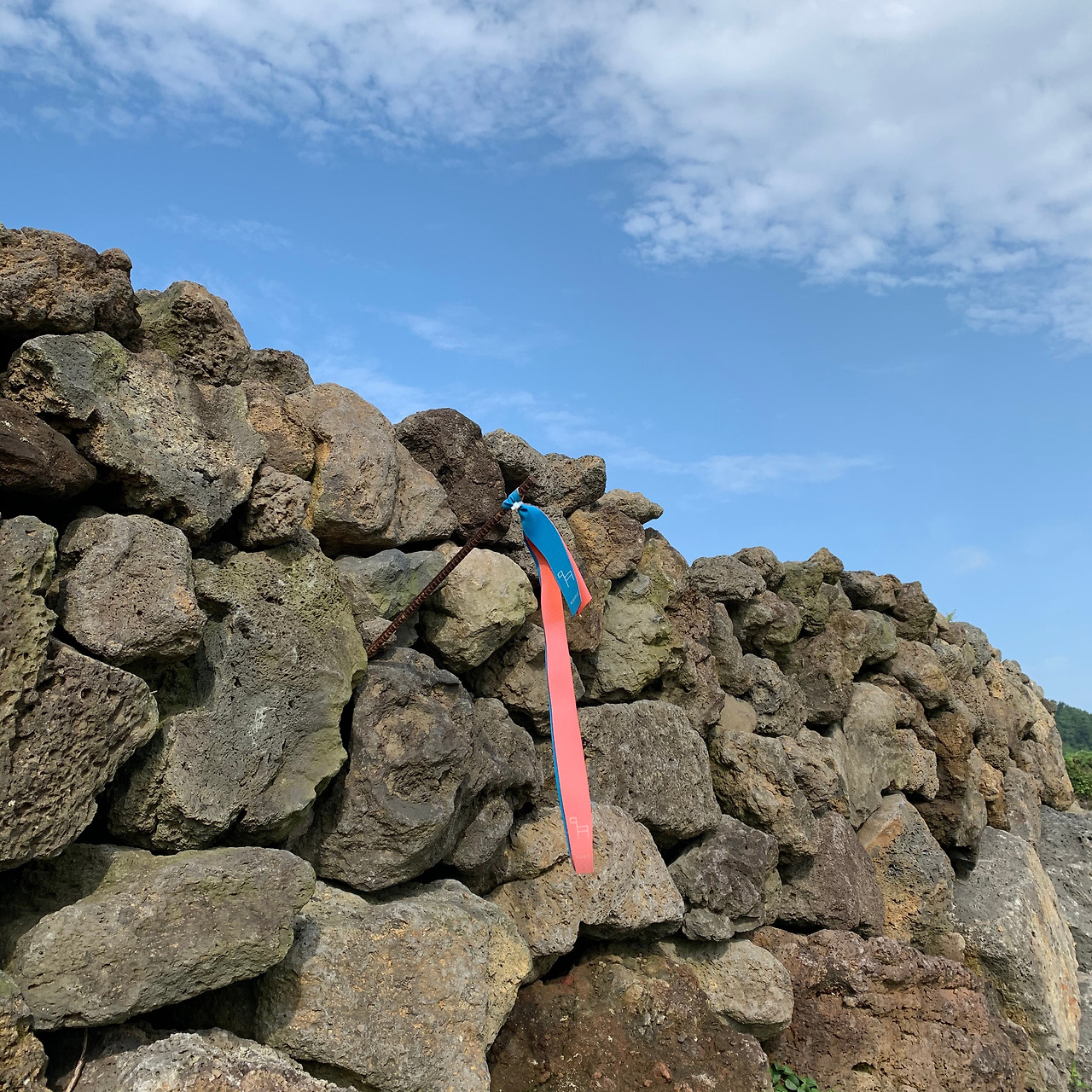 투박하지만 정교하게 쌓아 놓은 돌담과 길 옆 가지런하게 펼쳐진 밭을 보며 걷기 시작했다. 돌담 사이에서 첫 리본을 발견했다. 앞으로의 여정동안 든든한 길라잡이가 되어줄 표시이기에 괜스레 신이 났다. 10분정도를 걸었을까, 금방 말미오름이라는 걸 알려주는 간세 표지판과 화살표가 나타났다. 정방향으로 가고자 하면 파란색을, 역방향으로 가고자 하면 주황색을 따라가면 된다고 했으니, 간세의 머리가 향하고 있는 쪽으로 나아갔다.