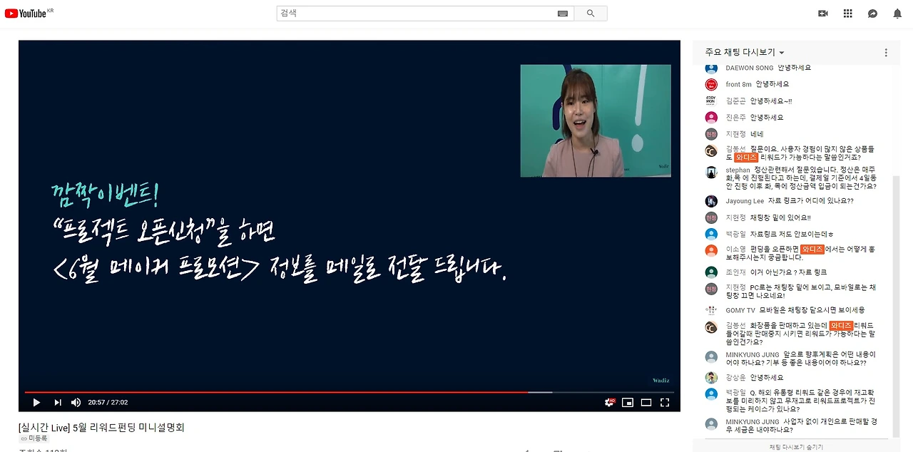 경험이 부족하지만 흡수가 빠른 사람의 장점은 0 to 1이 쉽다는 것이다. 회사는 막 시리즈 C 투자를 받은 시기였고, 나는 거의 프리 롤로서 프로젝트 단위로 새로운 일을 벌이는 역할을 했다. 들어오자마자 대학생 공모전을 열었다. 코로나 시국 전, 당시엔 잘 없었던 유튜브 라이브 교육을 처음 진행해 보기도, 믿을 만한 대행사 정보를 제공하는 ‘펀딩메이트’라는 프로그램도 만들었다.