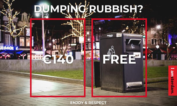 주 대상은 만 18세~34세의 젊은 네덜란드, 영국인 청년들을(특히 남성들) 주 대상으로 겨냥하고 있다고 한다. 개인적으로 삽입된 슬로건이 정말 인상적이라고 생각하는데 첫 번째 사진에서 볼 수 있듯이 쓰레기통과 아무것도 없는 장소를 빨간 네모로 강조하며 무단 투기를 하면 ‘쓰레기 무단 투기를 하면 €140유로를 내고 버려야 하지만 쓰레기통에 버리면 공짜다.’라는 말을 담고 있다.