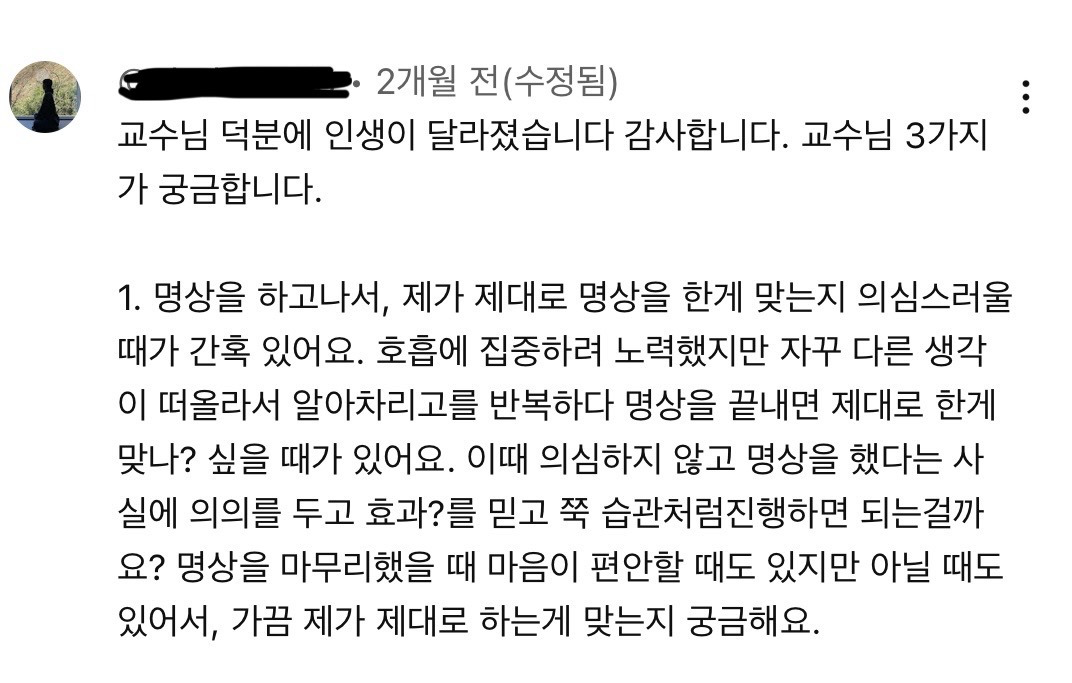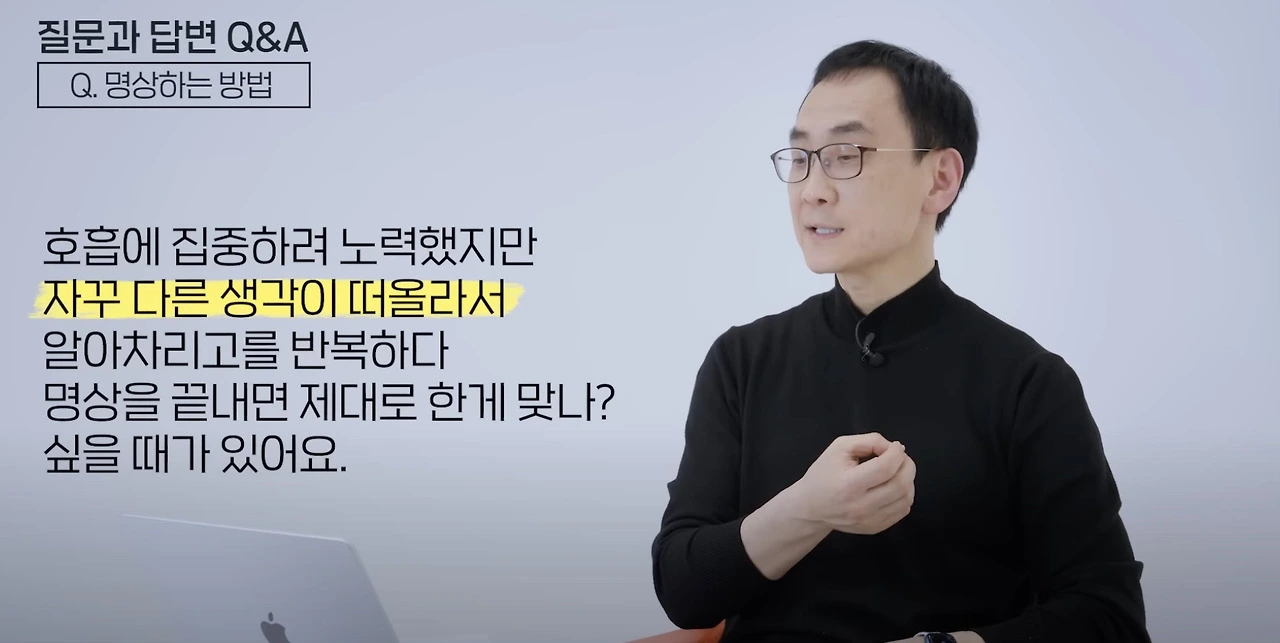 때마침 나의 랜선 명상 스승 김주환 교수님께서 본인의 유튜브 채널을 통해 명상과 관련된 질문을 받겠다는 공지글이 올라왔다. (김주환 교수님은 -명상을 사랑하는 명상 덕후들이라면 당연히 잘 알겠지만- 작년 초 내면소통이라는 책을 출간하여 명상의 대중화를 이끄신 국내 명상 분야 최고의 권위자다. 나도 김주환 교수님의 내면소통이라는 책 덕분에 명상이라는 세계를 처음 접하고 입문하게 되었다.)