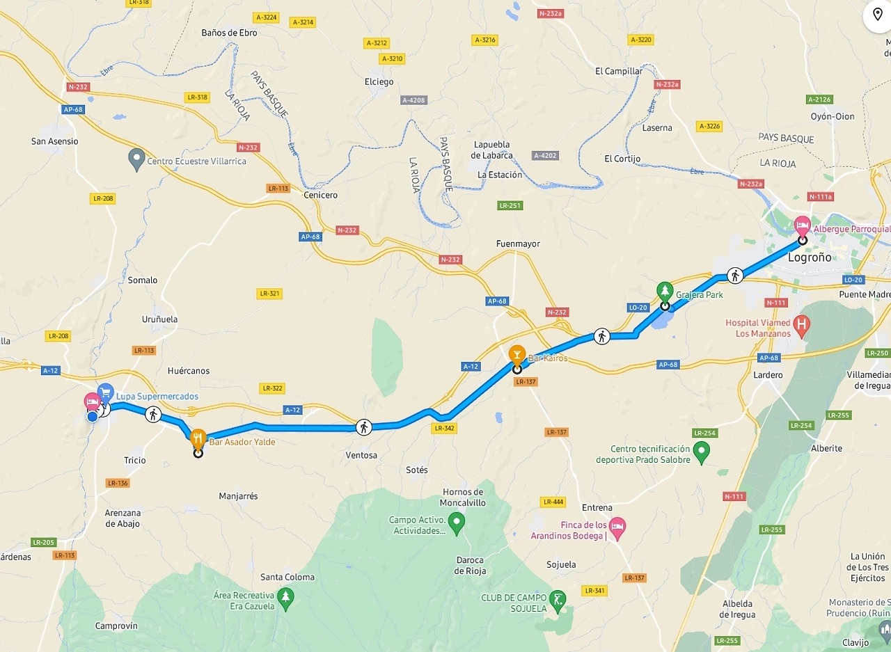 10일 : Logrono부터 Najera까지 약 29km오늘은 목적지까지 거리가 꽤 멀뿐만 아니라 오후 1시부터 기온이 30도 이상으로 올라갈 예정이다. 가능한 한 아침 일찍 나가는 것이 좋아 보인다. 4시 30분에 눈을 뜨고 가방을 챙긴다. 수면의 질은 순례길 역대급 최악이었다. 건물 바로 앞의 골목길에는 밤새 수많은 취객들이 지나갔다. 개 짖는 소리, 시끄럽게 떠드는 소리, 노래 부르는 소리가 그대로 내 귀마개를 뚫고 들어왔다. 내가 부스럭 거리는 소리에 마르틴도 일어나 준비하기 시작한다. 어제저녁까지 둘이서 정말 많은 얘기를 나누었다. 나이를 잘 먹은 사람에게선 재밌는 이야기가 끝도 없이 나오기 마련이다. 그와 함께 아침을 먹고 길을 나선 지 좀 뒤에 같은 숙소에서 지낸 한국인 나은에게 카카오톡이 왔다. 내 물건이 아니냐는 물음과 함께 보낸 사진에는 내 태블릿과 키보드가 덩그러니 있었다. 지갑을 잃어버린지 한 주가 지나니까 그새 바보가 되어 있었다.