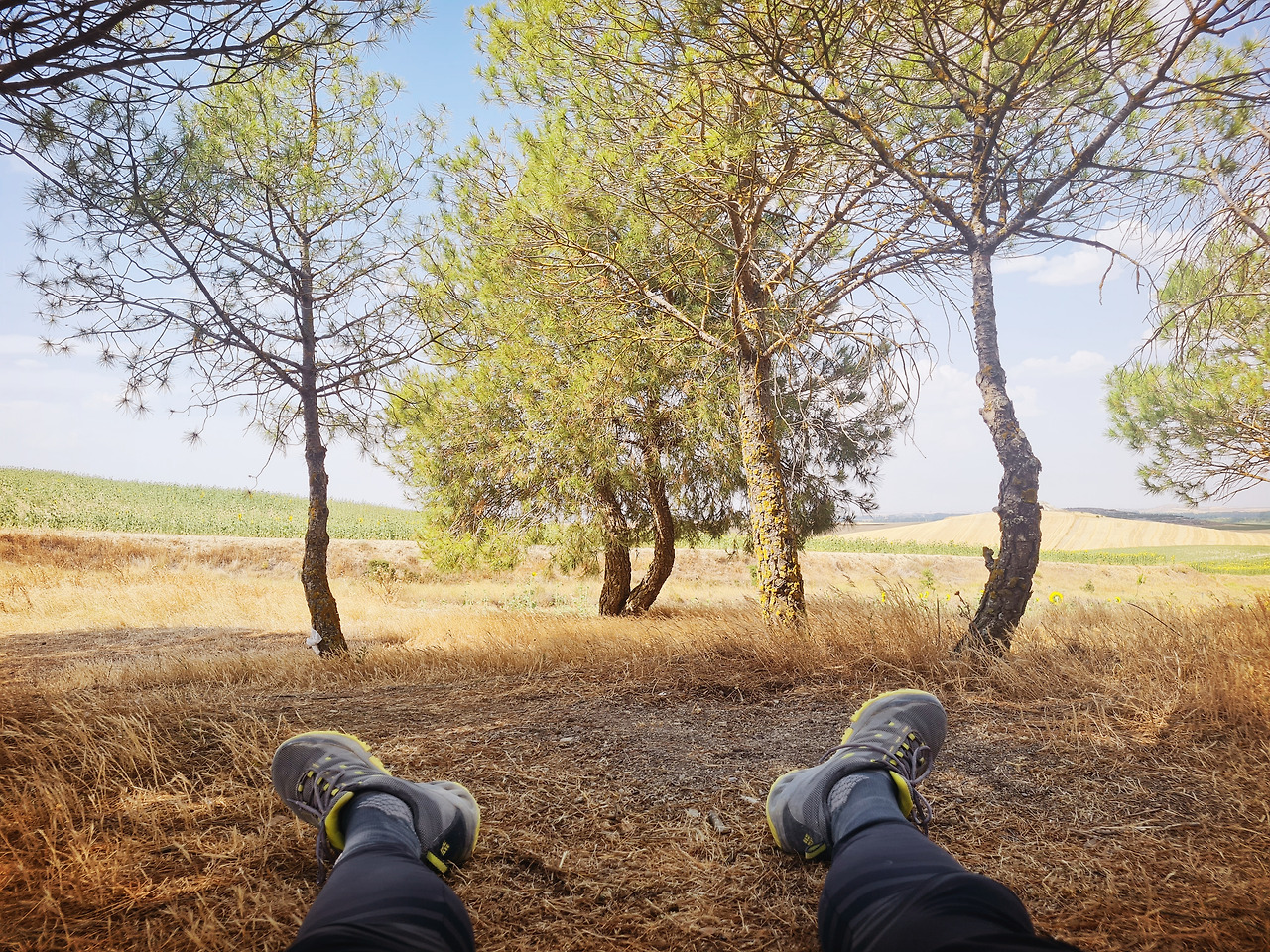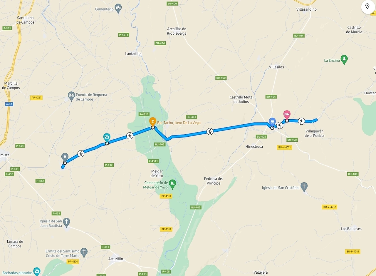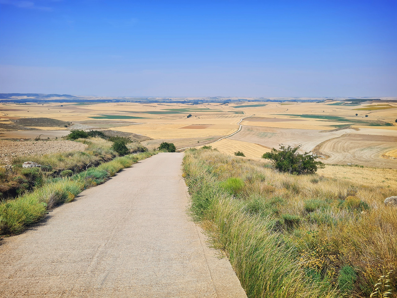 숙소에서 나와 근처 마을로 갔지만, 전반적인 분위기가 별로 마음 안 든다. Castrojeriz에서 사둔 먹거리들로 내일까지 문제가 없을 테니 차라리 오늘은 야영을 할까 고민한다. 아직 오후 수업이 하나 남았기에 급할 필요는 없었다. 바에서 얼음이 들어간 콜라를 마시면서 다른 순례자들과 얘기를 나누다가, 수업 시간이 가까워졌을 때 인적이 드문 쉼터를 찾아 벤치에 앉는다. 며칠 전에 데이터가 터지지 않아 꽤나 애먹었기 때문에 상태를 확인한다. 문제없다. 그렇게 수업을 시작하고 10분이 채 지나지 않아서 수업이 취소되었다. 스페인에 온 지 곧 3주가 되는데 여전히 적응이 안 된다. 이번 돌발 상황의 원인은 폭염이었다. 기온이 너무 높아서 그늘 아래에 있었음에도 태블릿이 견디지 못한다. 정상적으로 수업을 마쳤다면 편하게 쉬면서 조금 시원해질 때까지 기다렸다가 야영할 곳을 찾으러 갈 텐데, 너무 어이가 없는 나는 그대로 길을 나선다. 이 폭염에 길을 나서는 게 제정신인가 의구심이 들 수 있겠지만, 그랬다면 순례길에 오르지도 않았을 것이다.