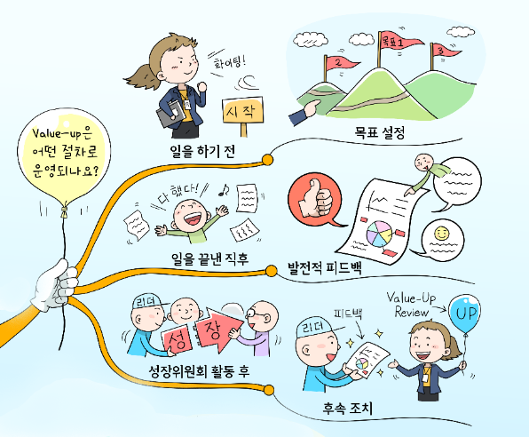 밸류업은 아직 첫 걸음마에 불과하다. 내부에서도 긍정적 피드백도 있지만 ‘힘들다. 시간 없다. 리더의 권한이 없다.’는 불만의 소리도 있다. 하지만 함께 목표를 설정하고 그 목표 달성 과정을 공유하고 피드백해서 일을 한 단계 업그레이드 시키는 것은 리더의 중요한 역할이다. 일을 통해 개인이 성장하고 조직의 성과로 연결해 내는 평가제도 벨류업은 시대의 흐름에, 개인 및 조직에게 꼭 필요한 제도라고 생각한다. 내가 하는 일을 통해 성장하고 세상에 긍정적 영향력을 미치는 연결고리라고 믿기 때문이다. 나와 조직 모두 성장하는 최대 공약수를 넓히기 위한 제도는 밸류업이라 확신한다. 코로나19 및 기술의 발전으로 다가온 언택트 시대에도 목적과 피드백 중심의 밸류업은 강조될 것으로 전망하고 있다.