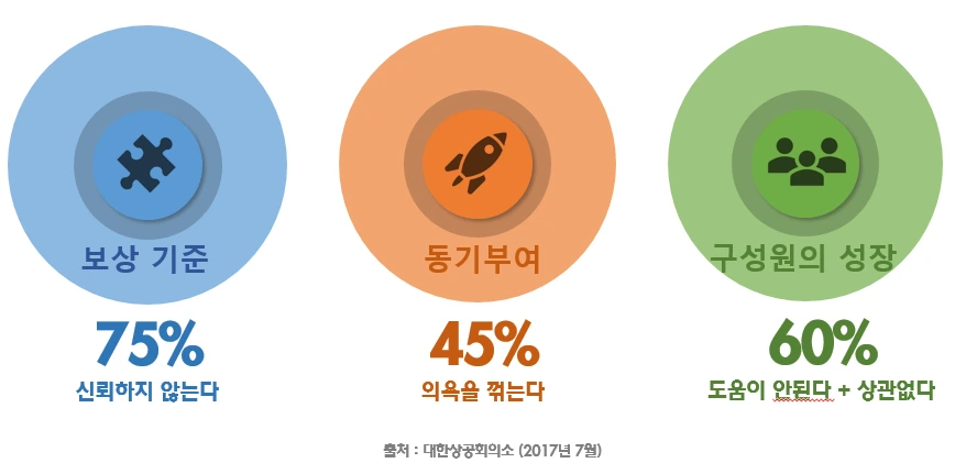 2017년 7월 상공회의소에서 직장인 700명을 대상으로 평가제도 신뢰도를 조사했다. 평가제도를 신뢰하는가?라는 질문에 75.1%는 신뢰하지 않는다는, 다소 예견되었지만 충격적인 결과가 발표되었다. 평가가 합리적이고 투명하며 공정하다고 생각하지 않았다. 배경을 보면 평가가 보상과 연결이 되면 될수록 승진자 밀어주기, 우수 평가 돌려받기, 정치, 줄세우기가 만연하고 있음을 알 수 있었다.