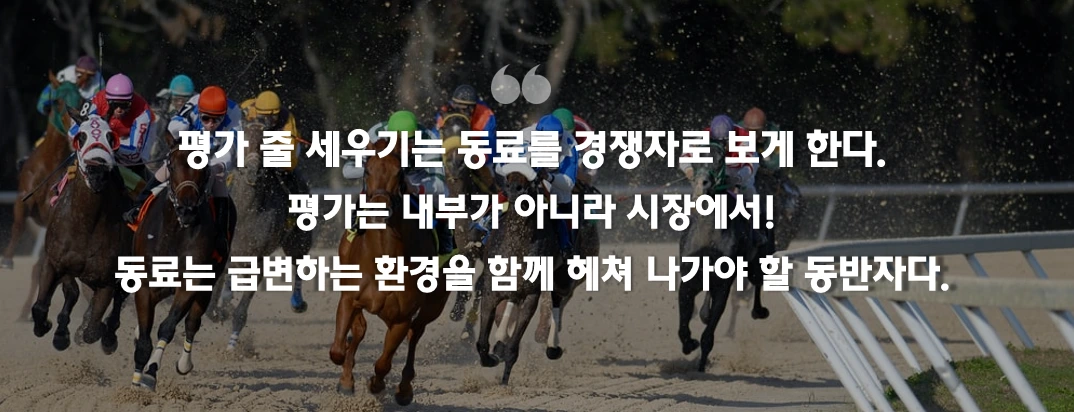 목적에 따라 애자일하게, 적응하면서, 스스로 판단하며 일을 진행해야 한다. 변화하는 환경에 적응하기 위해선 성장이 필요하다. 평가 시스템도 성장에 초점을 맞춰야 변화에 적응하는 능력을 키울 수 있다고 생각했다. 이제는 변화하는 세상에 대해 스스로 판단하며 빠르게 적응하고 변화하는 시장에 맞는 창의적인 것을 만들어 낼 수 있는 사람들이 필요하다. 그런 사람들을 모아서 일하는 조직의 능력이 더더욱 중요해졌다. 그런데 이런 변화는 개개인이 아니라 조직의 문화, 제도, 시스템이 바꿔야 한다. 그리고 무엇보다 평가는 내부가 아니라 시장의 평가가 진짜 아닐까? 내부 경쟁은 시선을 내부에서 이기고 싶게 만든다. 우리가 경쟁해야 할 상대는 동료가 아니라 외부 환경이다.