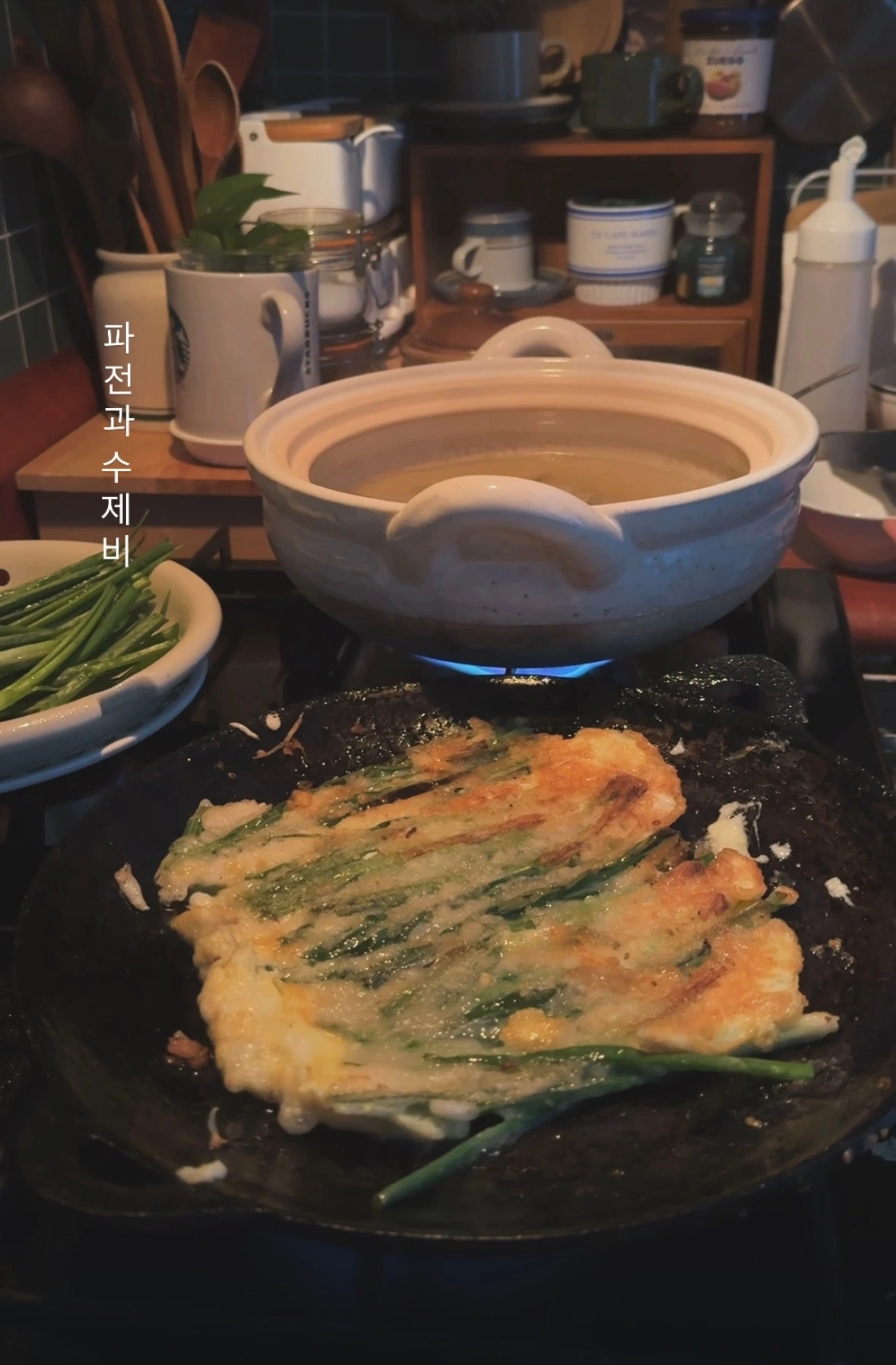 [담아~ 밥 먹자~ ] 하는 남편의 말에 아이는 못 이기는 척 방에서 나왔다. 그리고는 감사하게도 수제비 한 그릇을 깨끗이 비워냈다. 초장에 찍어 파전도 두어 접시 먹었다.