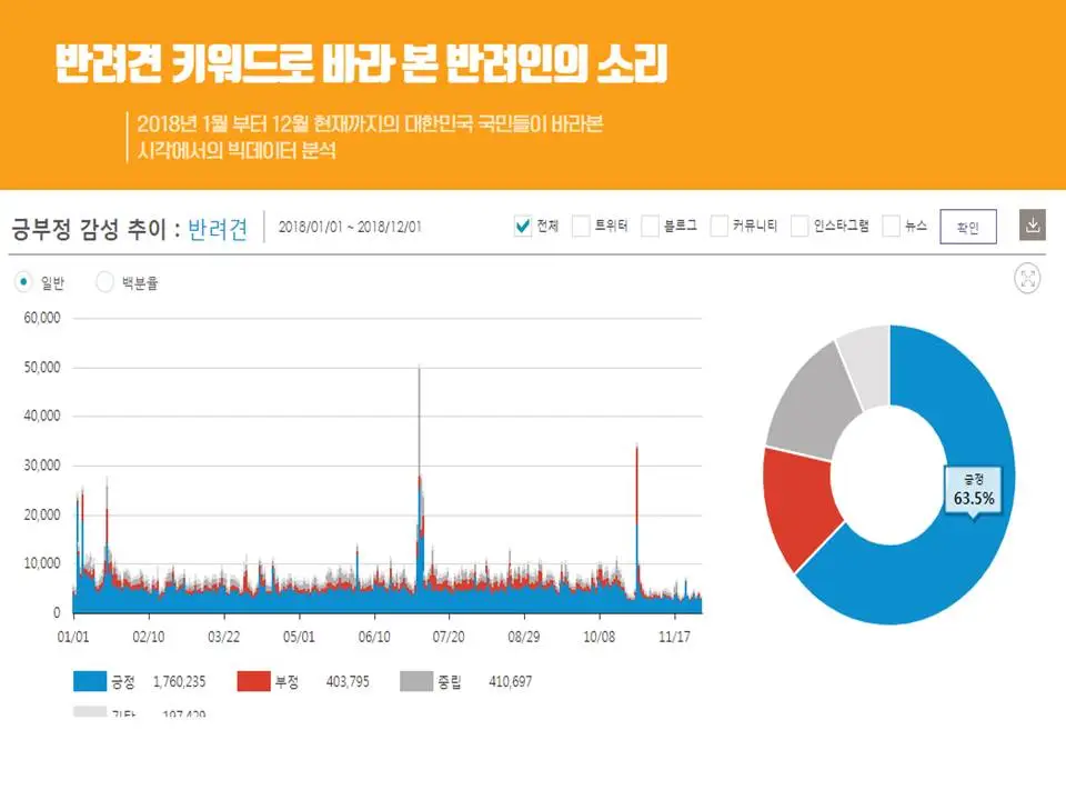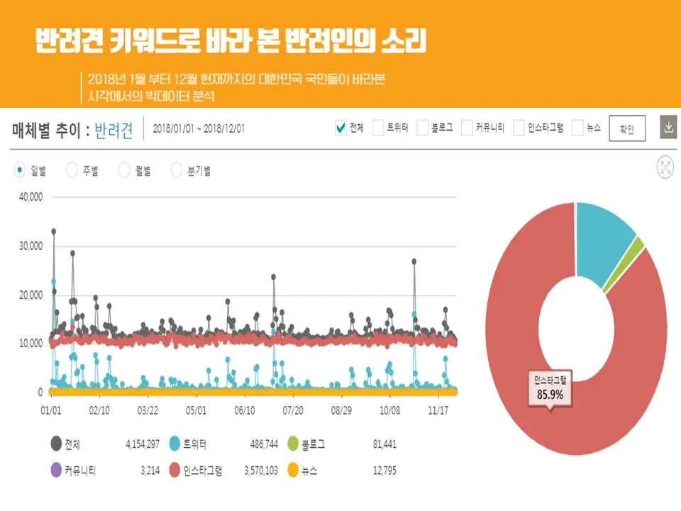 반려견에 대한 매체별 추이를 살펴보게 되면 다양한 채널중에 인스타그램이 많이 활성화 되는 것을 알 수 있습니다.