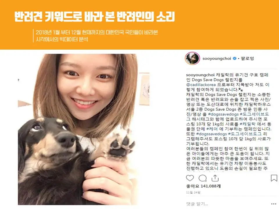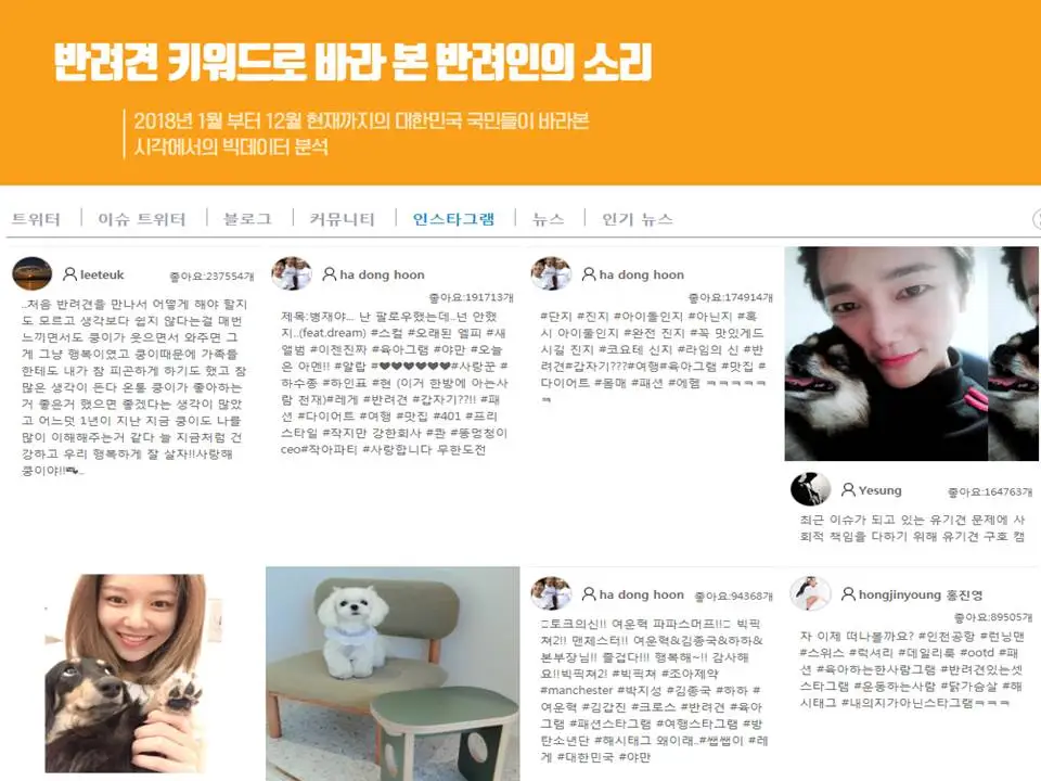 시대는 많이 변하고 있습니다. 1위 멍스타그램 2위 강아지 3위 일상에서 볼 수 있듯이 점점 사람들은 반려동물에 대해 애완의 의미보다는 가족으로써의 의미를 찾아가고 있는 것을 발견하게 됩니다.