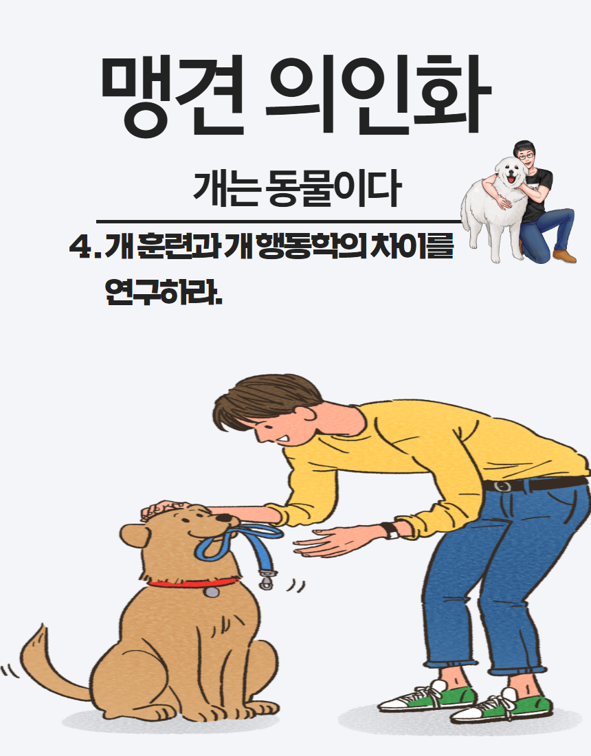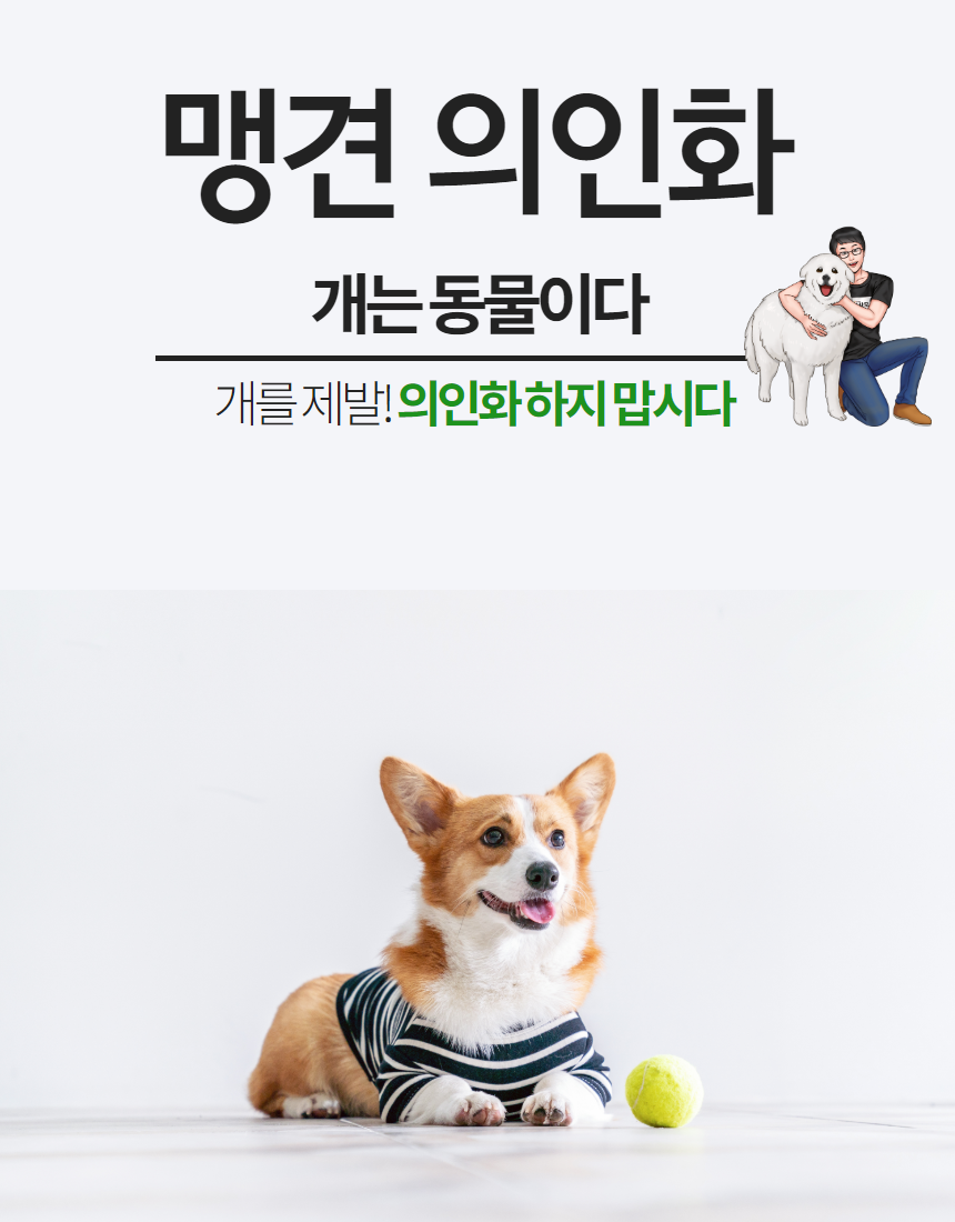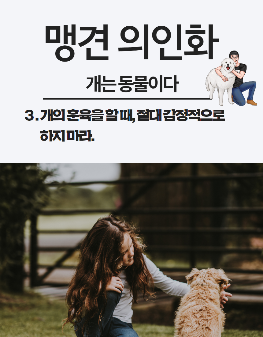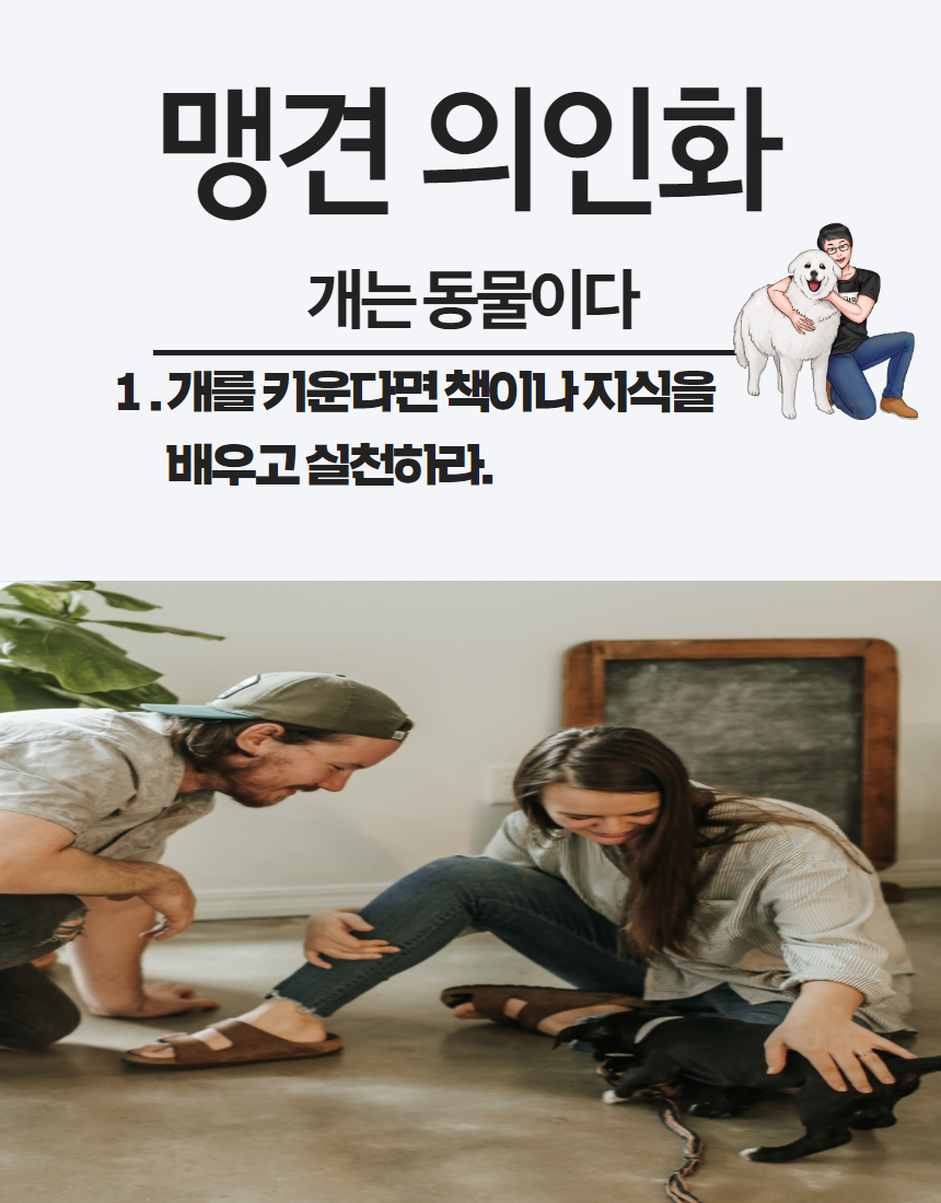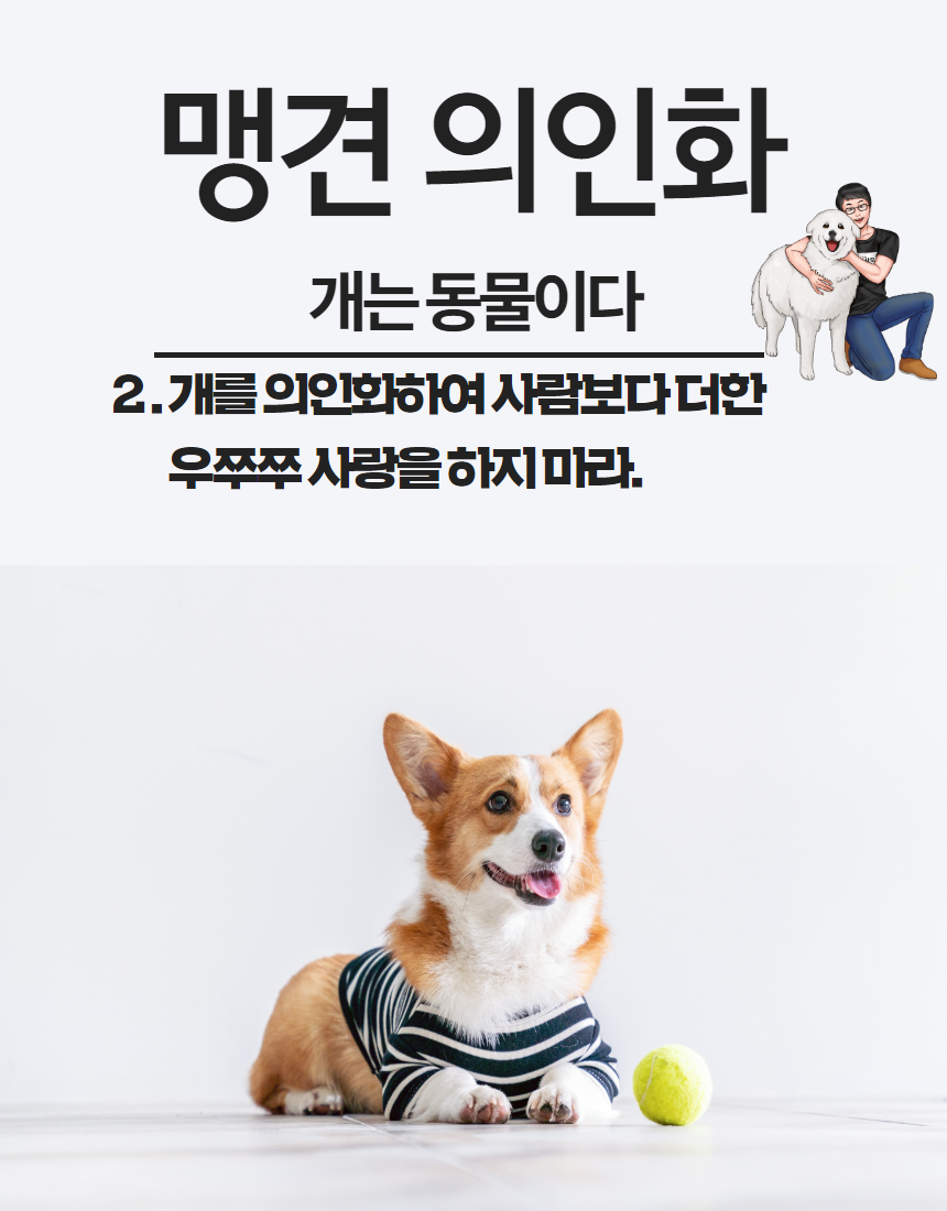 나는 개를 사랑한다. 하지만, 개는 개다! 개는 동물이지 절대 사람이 될 수 없다. 냉정하게 말한다고 해도 나는 정확하게 말할 것이다. 왜냐하면, 동물을 동물로써, 정확하게 이해하지 못하는 순간 강아지는 맹수나 이리와 비슷해질 수 있다. 부모의 무지함이 자식을 나쁜 길로 인도하는 것처럼 개를 키운다면 우리가 배우고 익혀야 하는 것도 이러한 이유 때문이다. 개를 키우면서 책 하나도 안 읽고 실천하고 경험하지도 않으면서 생명존중과 사랑을 논한다. 정말 말도 안 되는 이야기다. 오늘은 개를 자꾸만 의인화하는 그들에게 진심 어린 충고를 하고 싶어서 이 글을 쓴다.