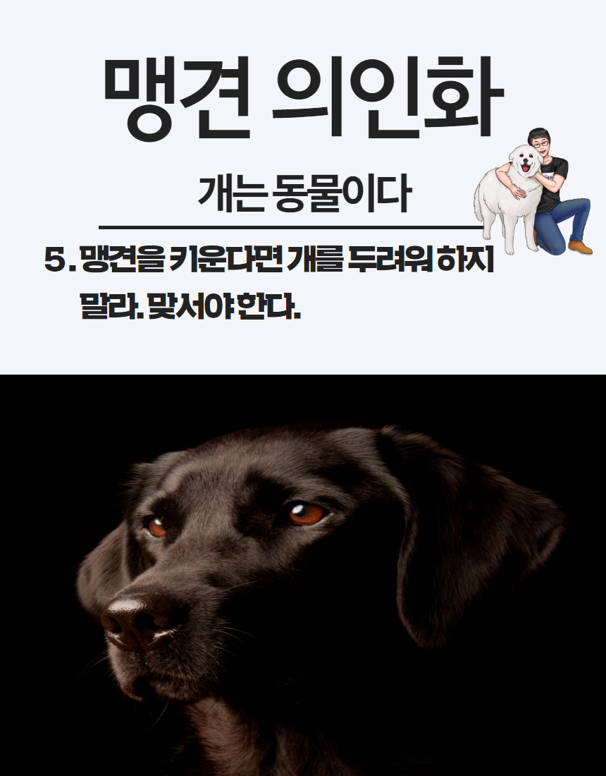 보통의 보호자들 중 맹견을 키우는 사람들을 보게 되면 개를 두려워하여 개가 으르렁거리거나 물려고 할 때 제지를 하지 못합니다. 즉, 사람은 모르겠지만 개는 알고 있습니다. 이 사람이 나를 두려워하고 내가 으르렁거리면 피한다는 것을 알고 있습니다. 그래서, 더 버릇이 없어지고 함부로 행동하게 되는 것입니다. 개를 키우면서 자신의 개를 두려워하는 순간 개는 주인뿐만 아니라 타인을 물 수도 있는 것입니다. 다시 한번 말하지만, 개는 사람이 아닙니다. 개는 개일뿐입니다. 동물을 동물로 이해해야 하는 일반적인 상식으로 개를 키워야 합니다.