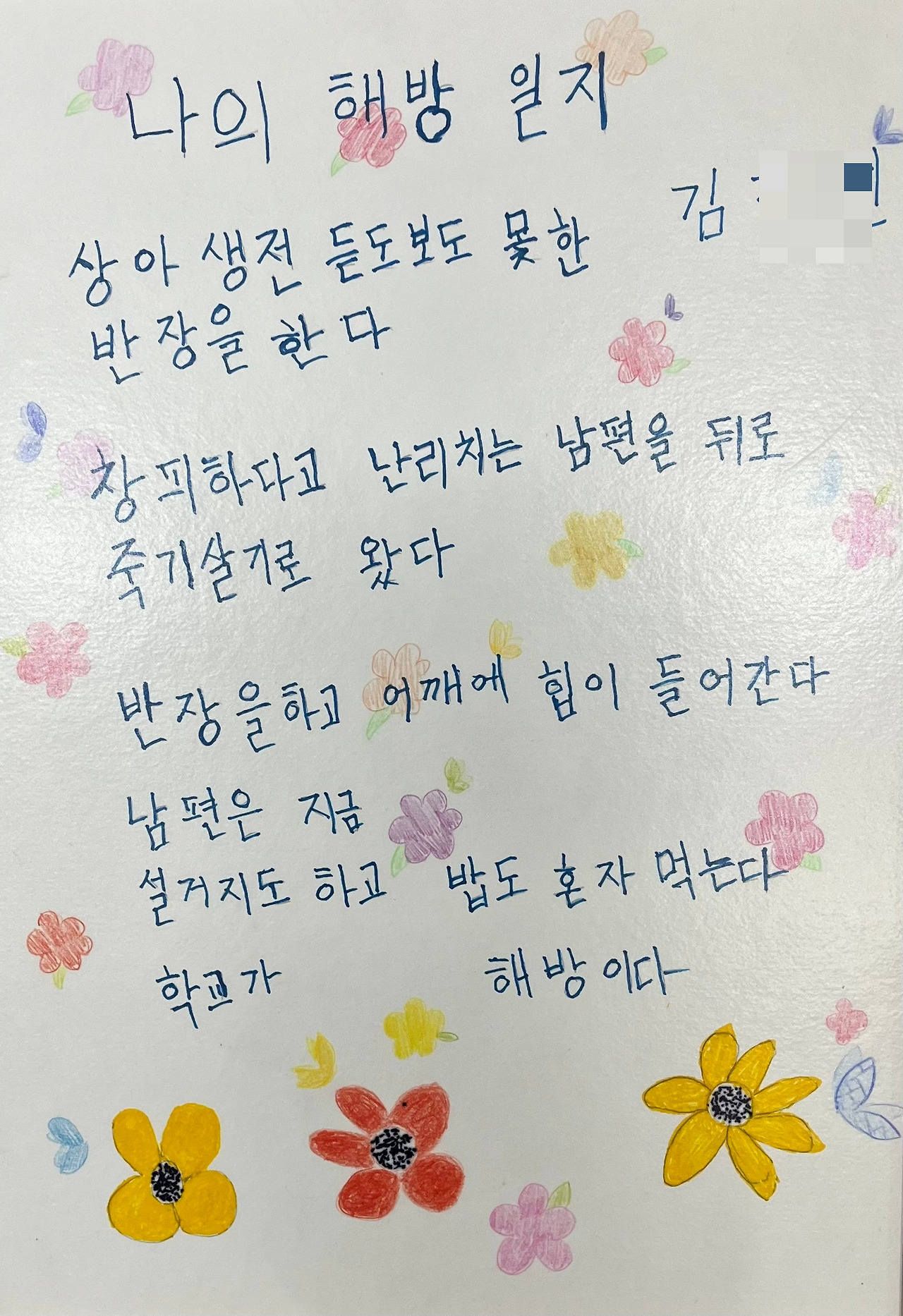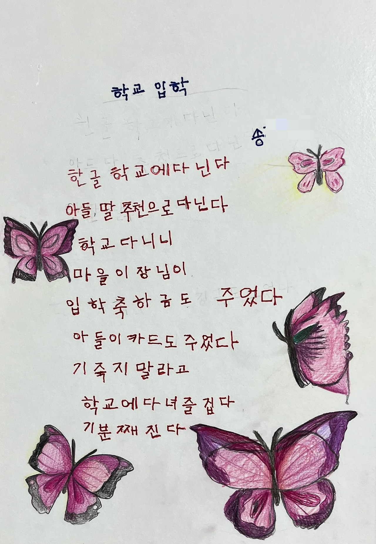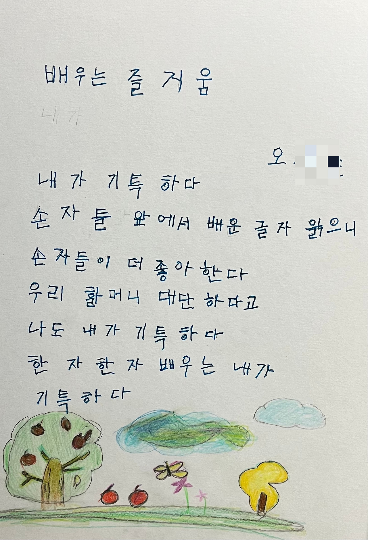 어릴 적, 그토록 다니고 싶었던 학교와 하고 싶었던 공부를 마음껏 할 수 있는 지금이 더없이 행복하고 즐겁다. 한글을 익히면 단계가 올라가 수학, 영어, 한자도 배운다. 수학여행도 다녀오고 이곳저곳 견학과 체험 학습도 많다. 나이 들어 누리는 새로운 세상 경험들이다.