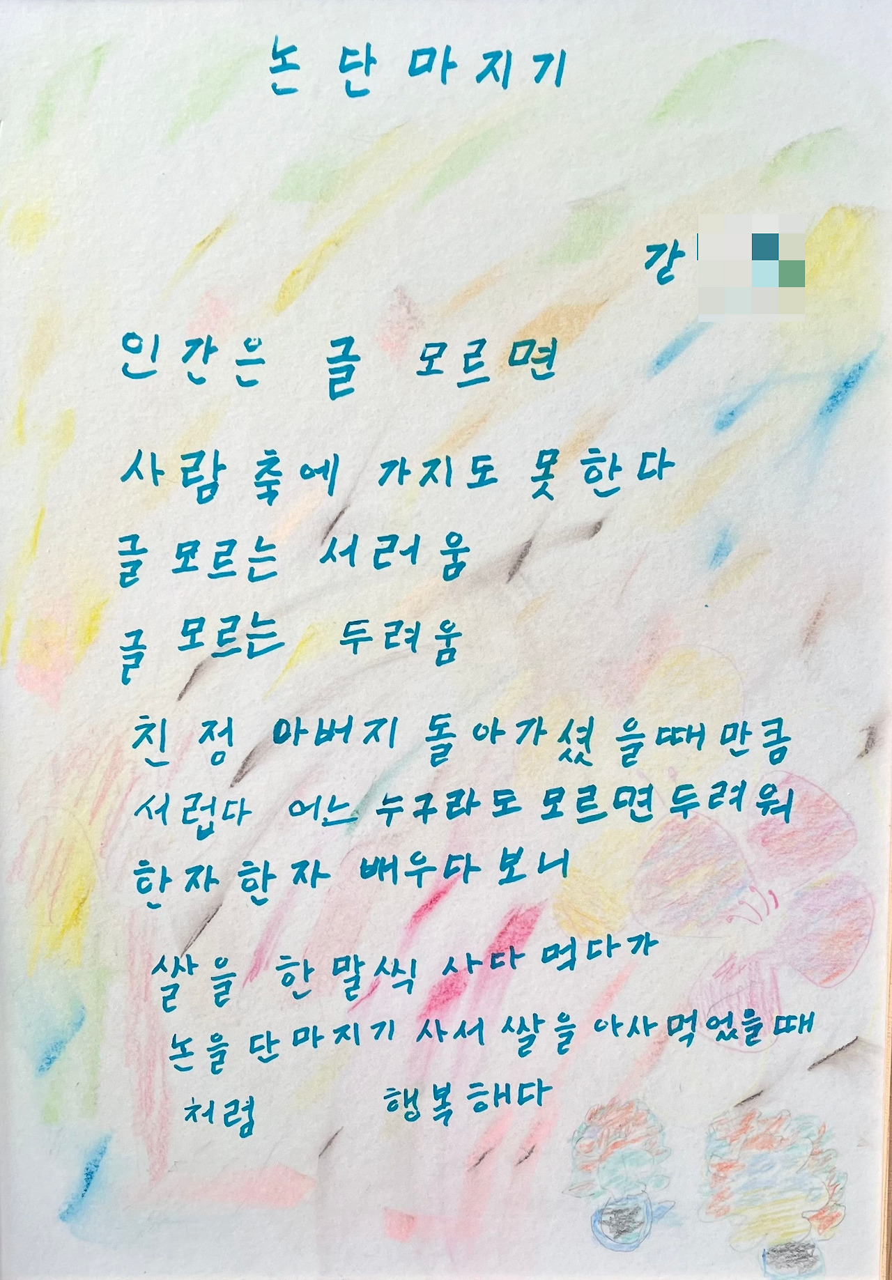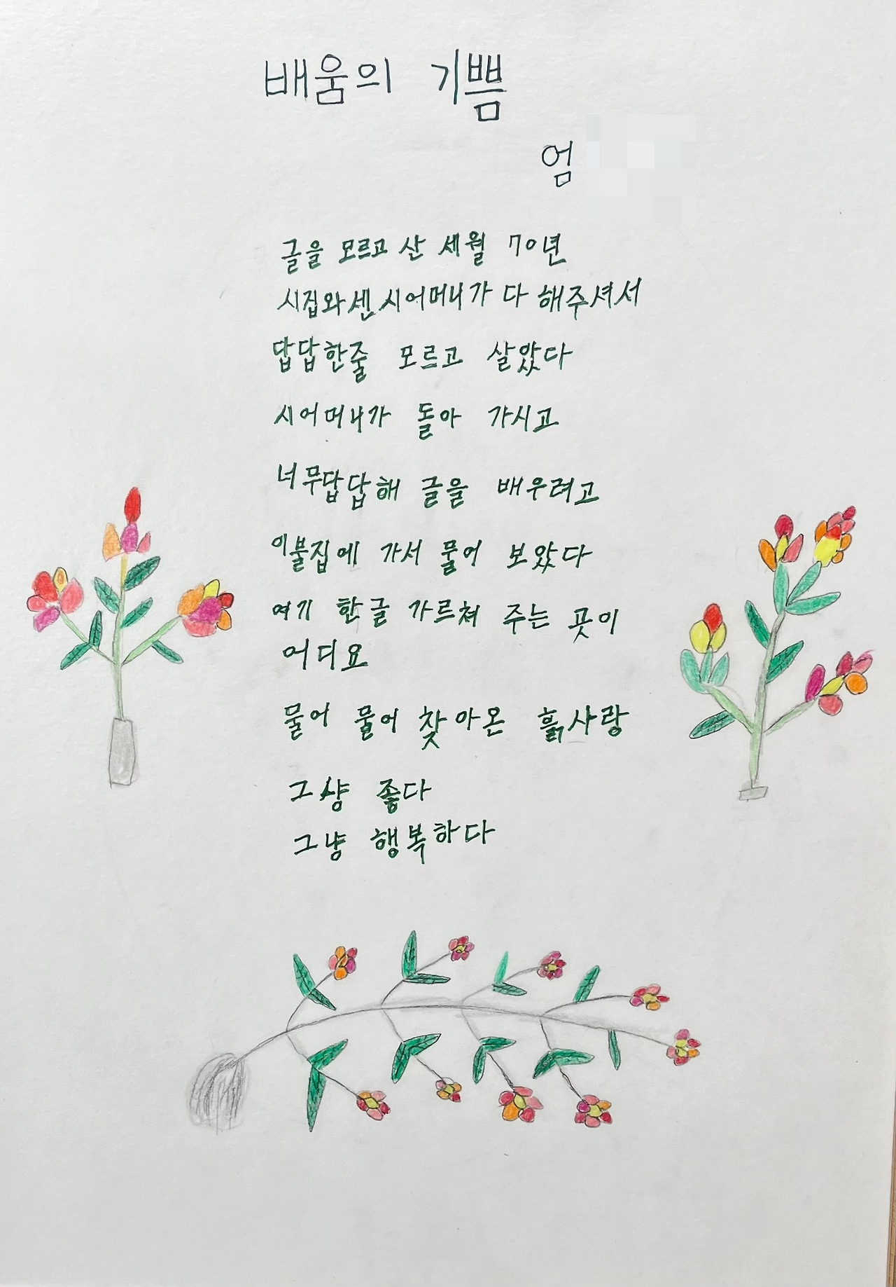 세상은 나날이 발전하여 더 많은 정보와 지식을 쏟아 내지만 글을 모르는 까막눈에게는 감히 넘볼 수 없는 사치였다. 문맹의 한은 더 단단하게 맺히고 쌓였다. 남은 시간이나마 이 한을 풀어야 했다.