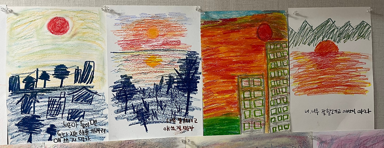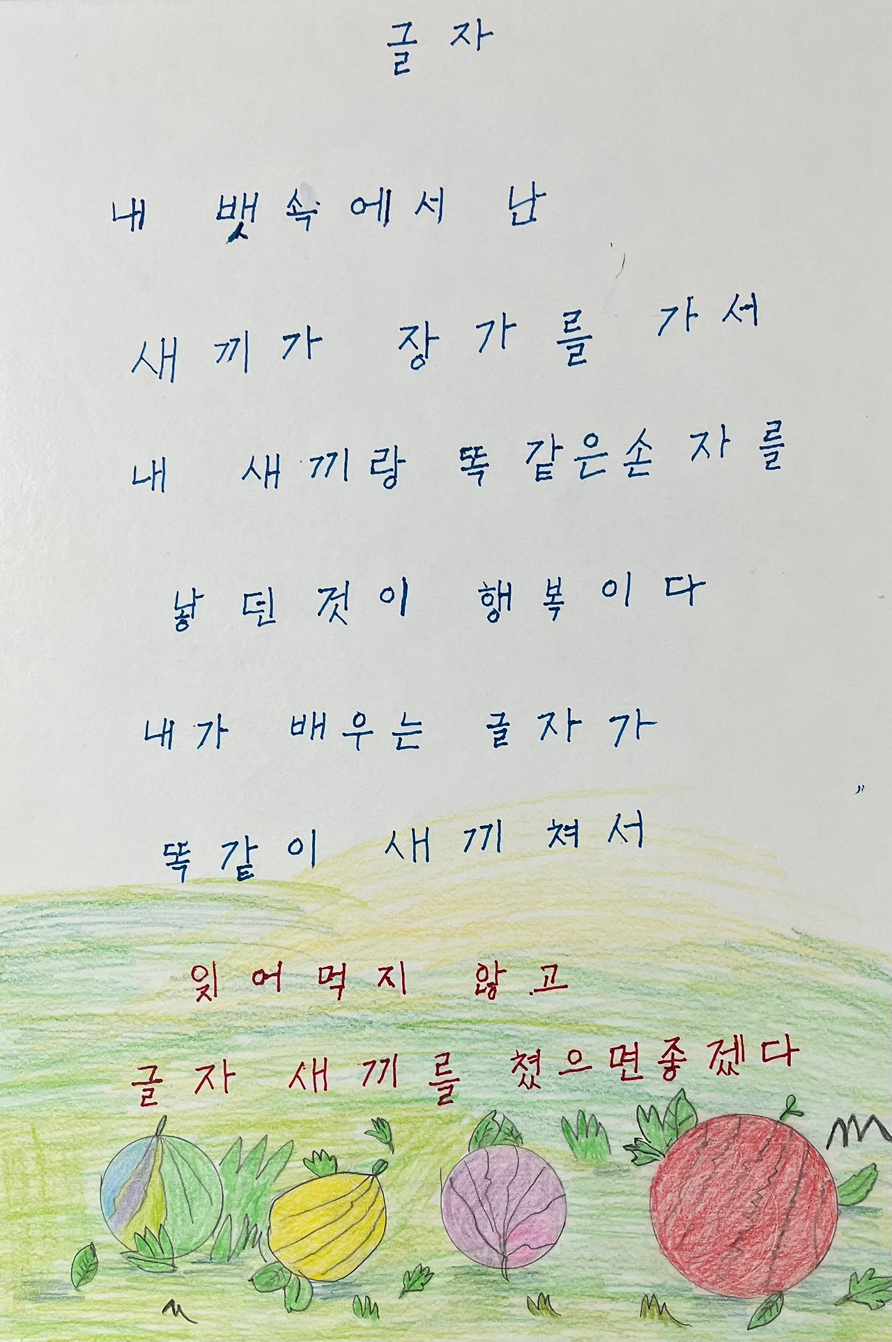 ㄱㄴㄷㄹㅁㅂㅅㅇ을 소리 내어 읽고 썼다. 반복해서 기억하며 배워나갔다. 함께 하는 사람들 모두가 한마음으로 깨우쳐 가며 서로를 다독이고 응원했다. 가갸거겨고교구규그기와 가나다라마바사아를 읽혔다.