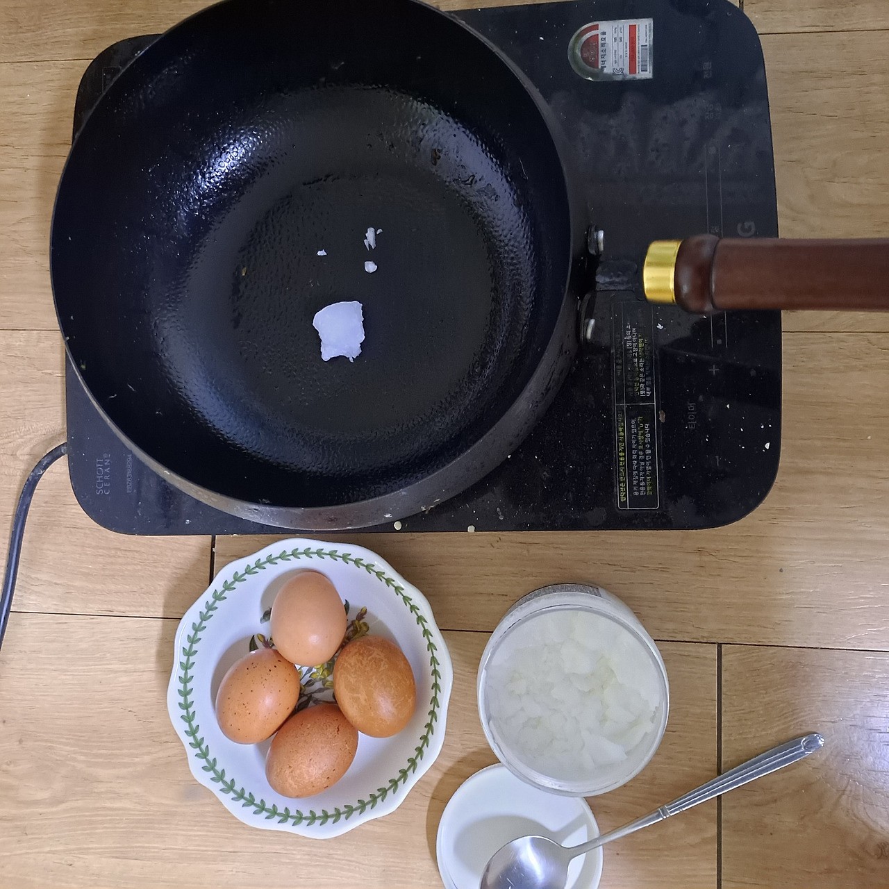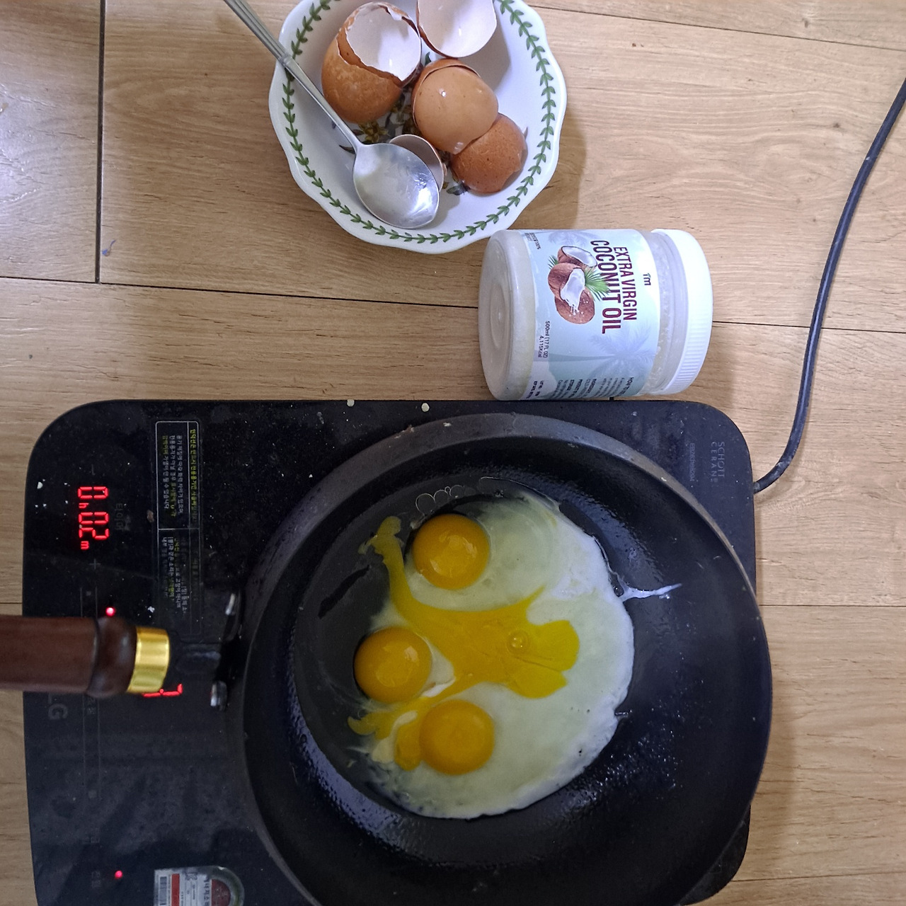철판에 코코넛오일을 두르고 프라이를 해서 먹는다