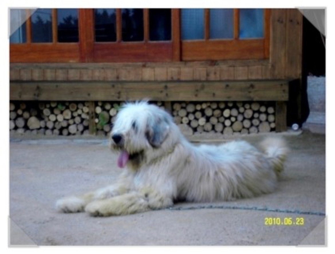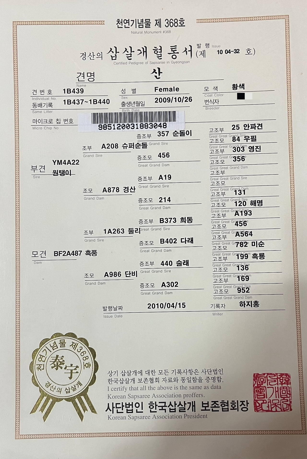 이름은 마을 지명인 강산리에서 따와 '산'이라고 지었다. 그렇게 황색 삽살개 4번은 한 가족이 되었다. 삽살개 보존협회에 등록도 하고 혈통서도 발급받았다.