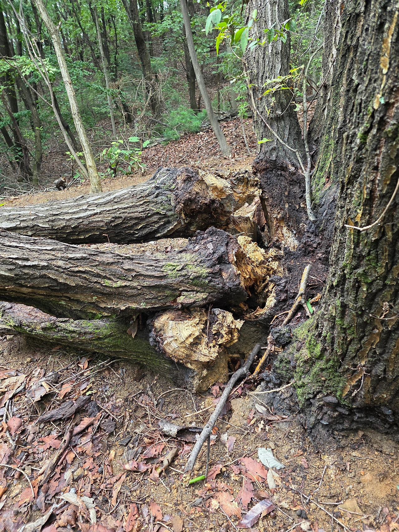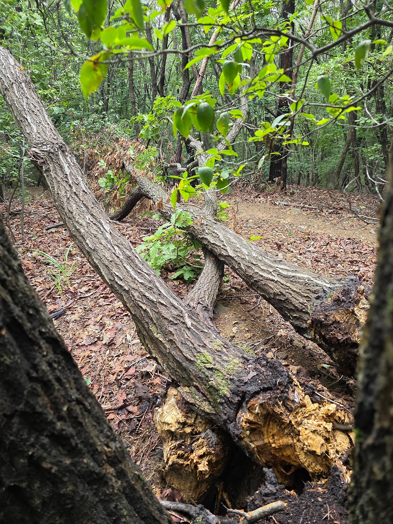 얼마 전 폭우에 큰 줄기 하나가 부러져 쓰러져 있던 나무가 기억납니다. 여러 갈래로 뻗어난 굳건한 밑동을 자랑하던 나무였는데, 오늘 다시 찾은 그 자리에는 거대한 나무 줄기 세 개가 길을 완전히 가로막은 채 쓰러져 있었습니다. 지난번 부러진 가지 하나가 결국은 나머지 줄기들을 버티지 못하게 한 것입니다.