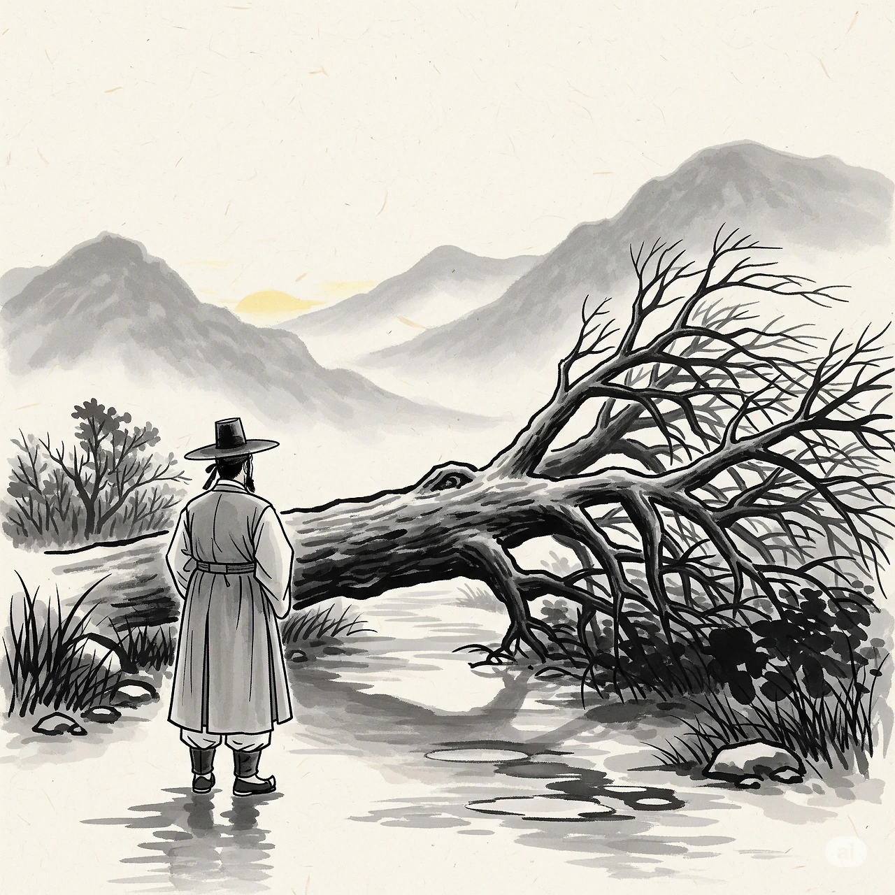 쓰러진 나무가 길을 가로막고 있어 평소와 다른 길을 돌아와야 했습니다. 나무가 쓰러진 여파가 저의 산책길에까지 영향을 미치고 있다는 사실에 복잡한 마음이 듭니다. 하지만 동시에 생각합니다. 이 나무를 섣불리 치우지 못하는 것처럼, 삶을 가로막는 장애물도 혼자 힘으로 해결하기 어려운 경우가 있습니다. 때로는 돌아가는 길을 택하고, 때로는 함께 힘을 모으는 지혜가 필요하다는 것을 오늘 이 새벽 산책길의 나무가 가르쳐주는 것 같습니다.