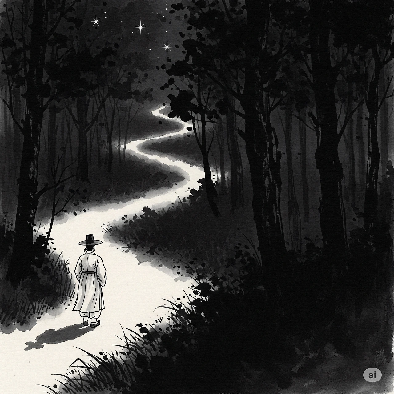 제 발바닥은 땅의 작은 변화를 더듬습니다. 울퉁불퉁한 흙의 감촉, 미끄러운 이슬을 머금은 돌멩이, 삐죽 튀어나온 나뭇가지의 날카로움까지. 발바닥이 느끼는 미세한 감각들이 곧 나의 길이 됩니다. 어둠 속에서 눈은 무용지물이 되고, 오직 발바닥만이 길을 알고 있습니다.