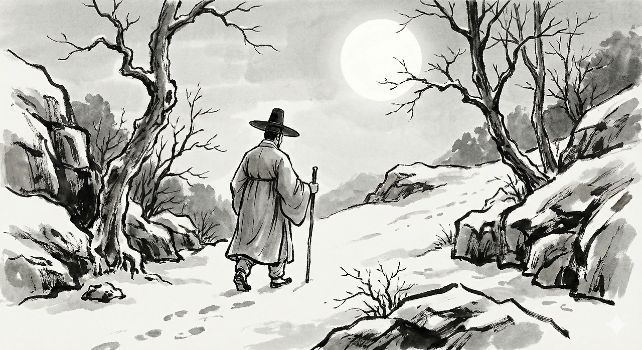 오늘 새벽 산길은 유난히도 밝습니다. 어제는 산 뒤에 숨었던 둥근 달이, 오늘은 제 자리를 굳건히 지키며 산등성이를 대낮처럼 환하게 비추고 있습니다. 덕분에 발밑의 얼어붙은 흙길도, 작은 돌부리도 선명하게 보여 발걸음이 한결 가볍습니다.