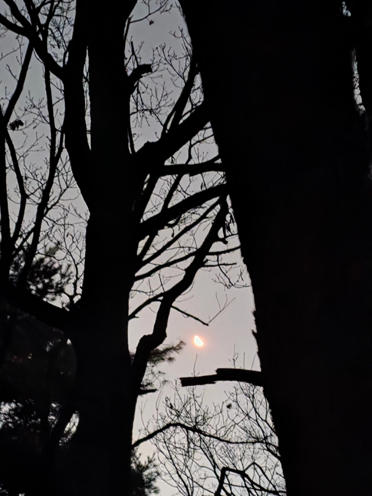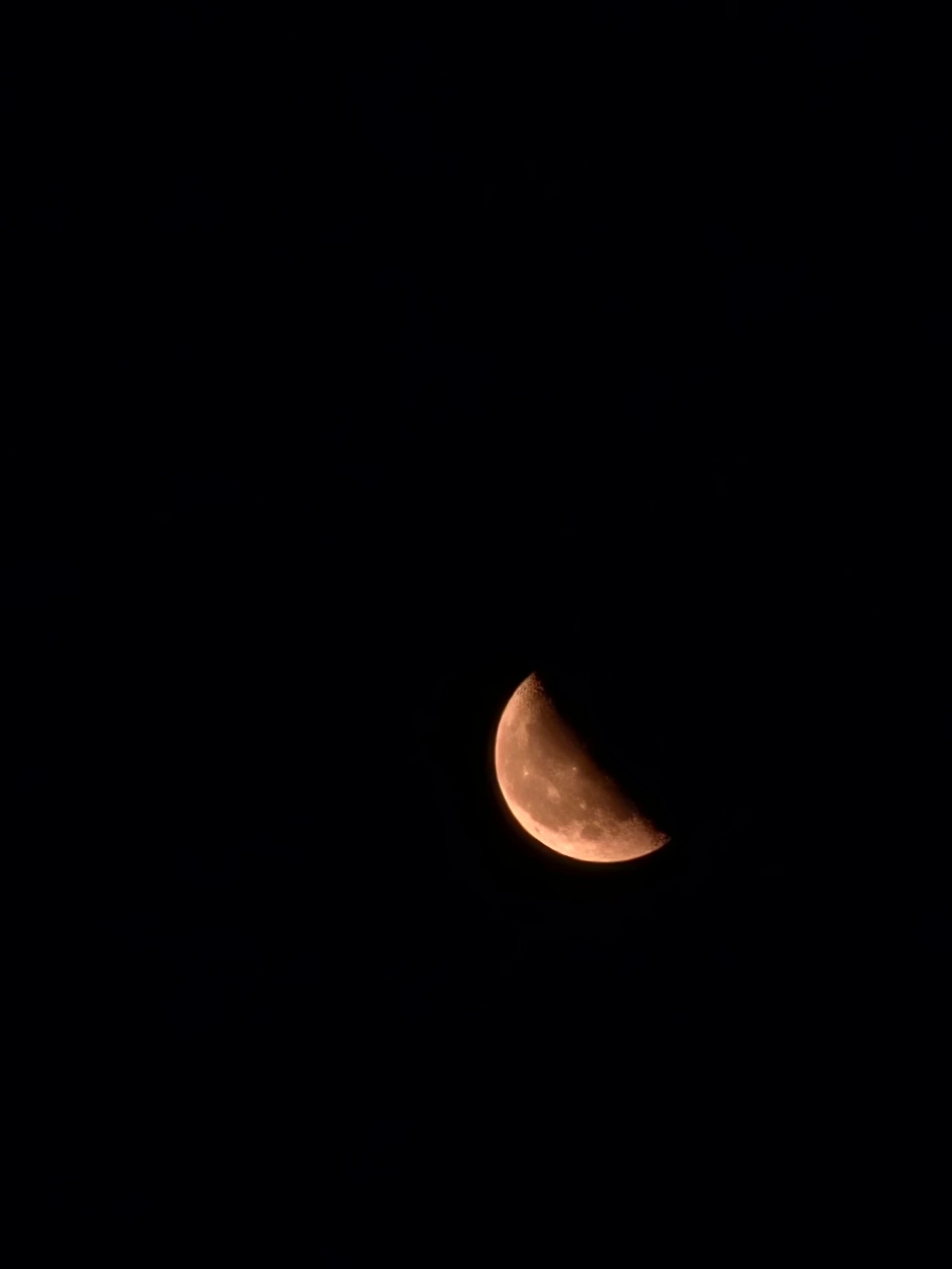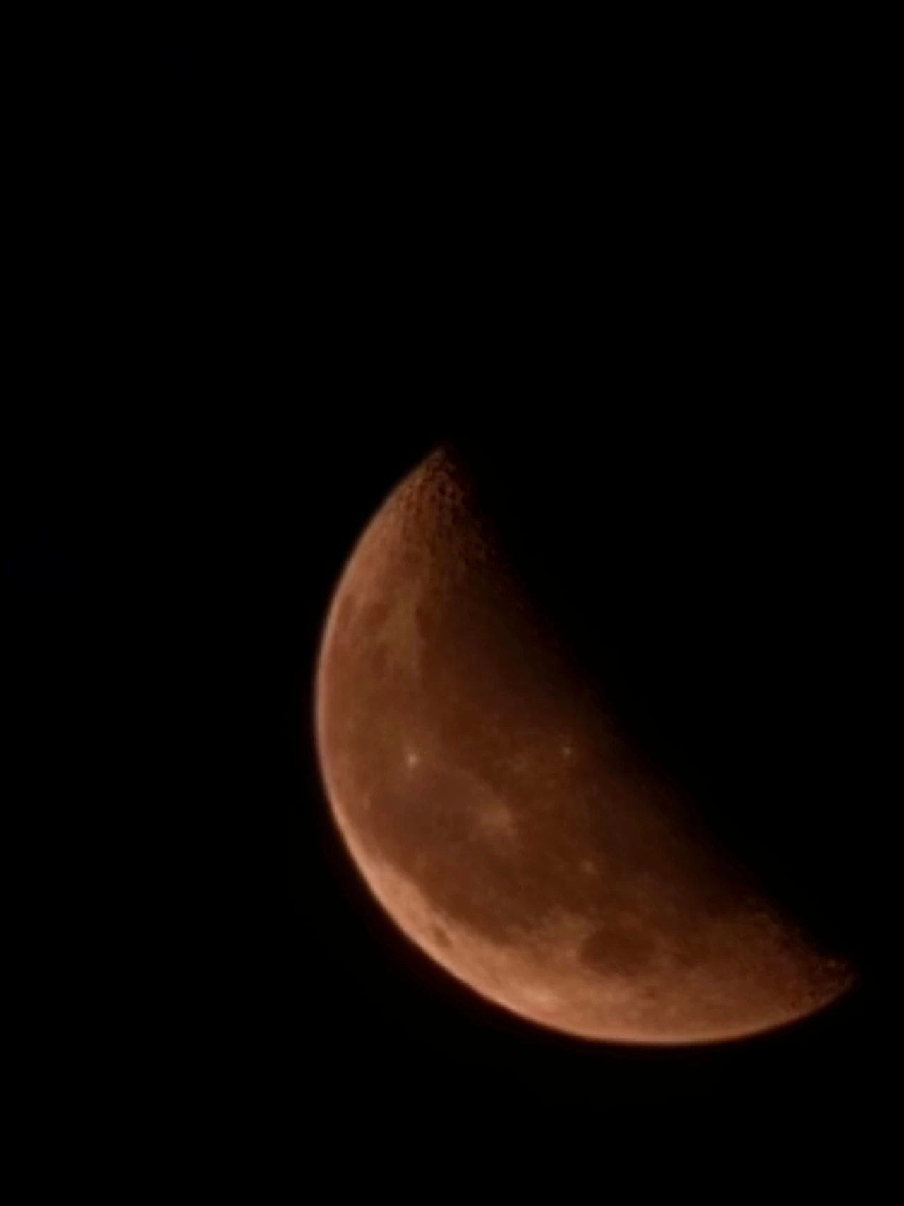어제의 피로가 머리에서 발로 땅으로 흘러 내려가는 기분입니다. 고개를 들어 하늘을 보니, 평소와는 다른 낯선 선물이 기다리고 있습니다. 반달보다 조금 작은 붉게 빛나는 달.