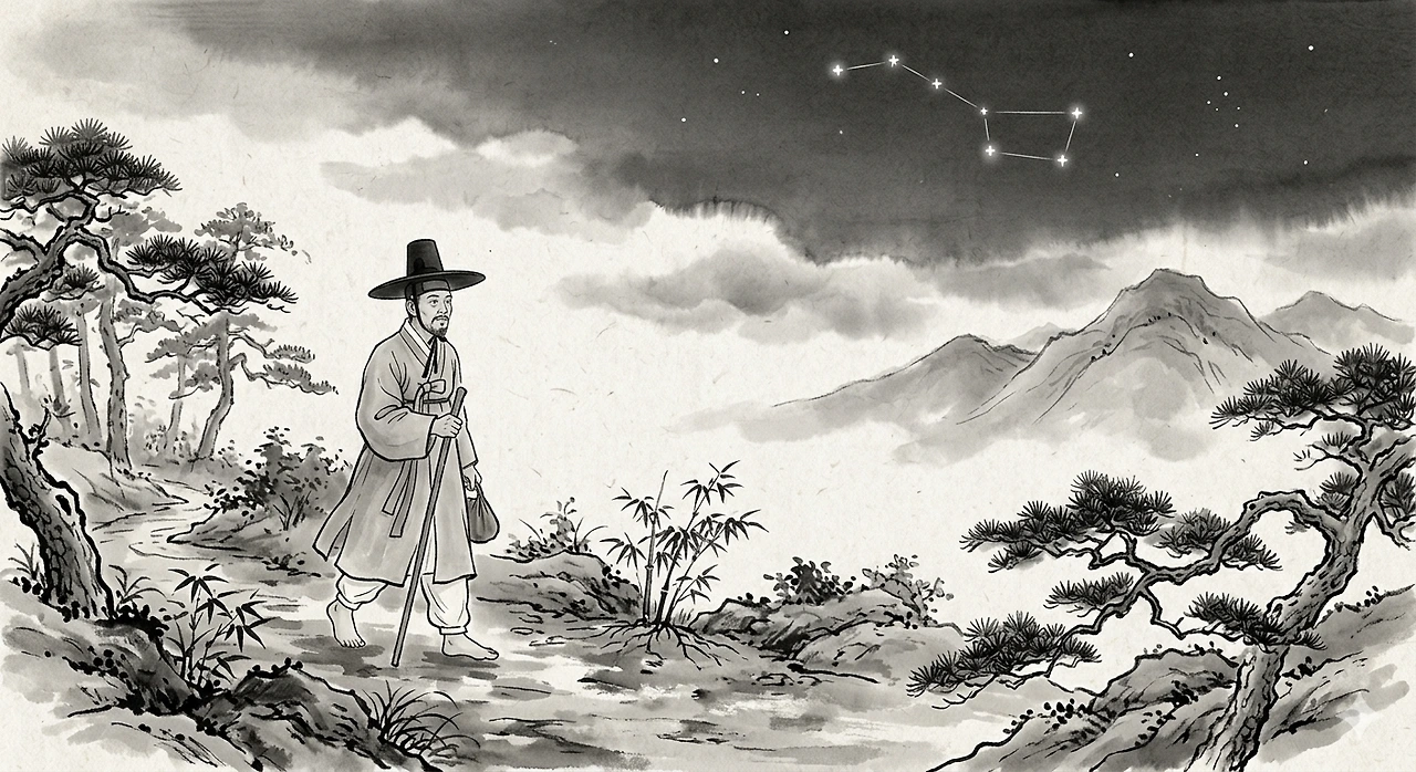 고개를 들어 하늘을 봅니다. 어제 내린 비가 세상을 씻어낸 덕에, 북두칠성이 유난히 또렷하게 다가옵니다. 한쪽엔 맑은 별빛이, 다른 한쪽엔 낮은 구름이 어깨를 맞대고 있는 이 신비로운 새벽길을 내려섭니다.