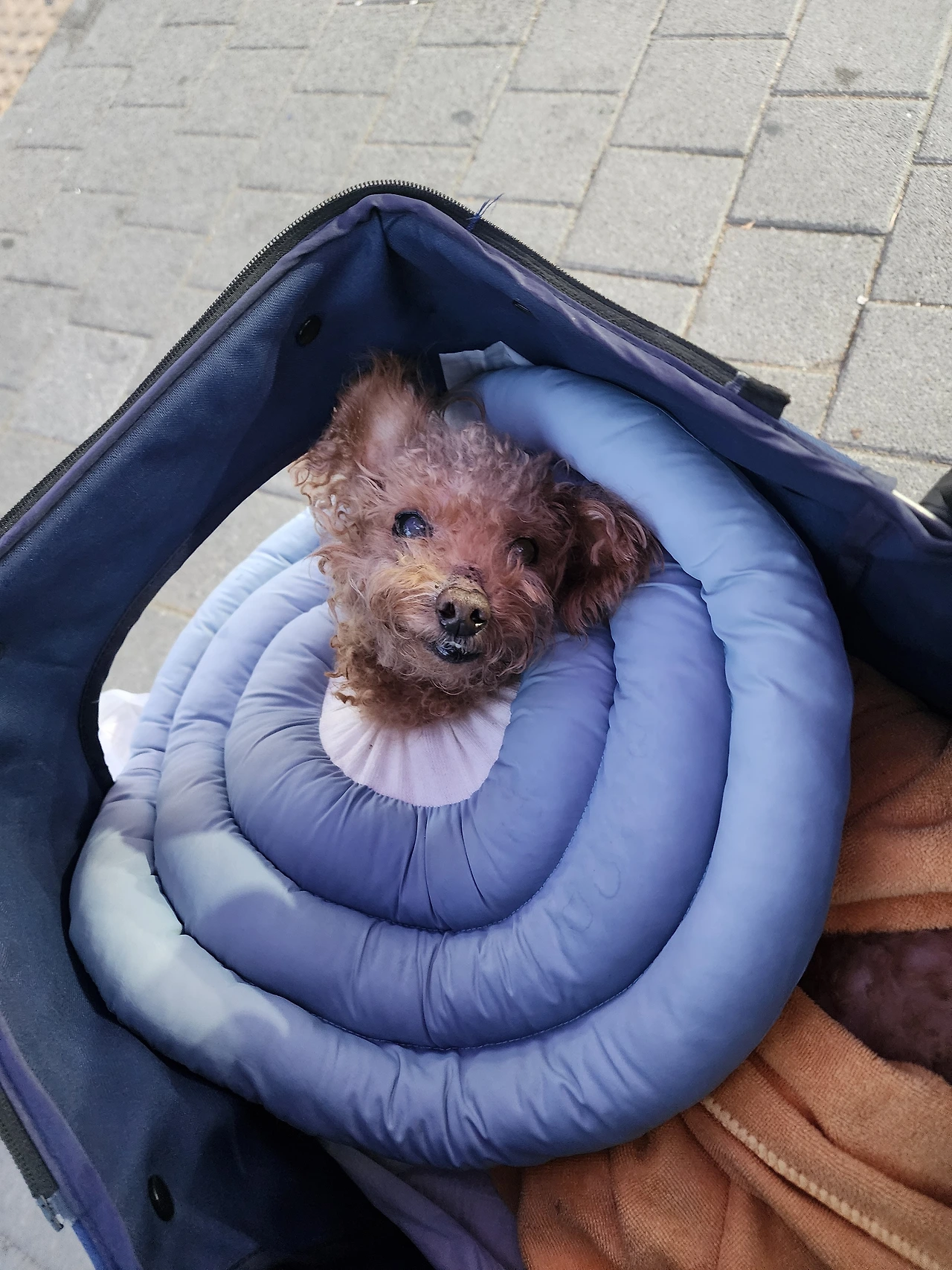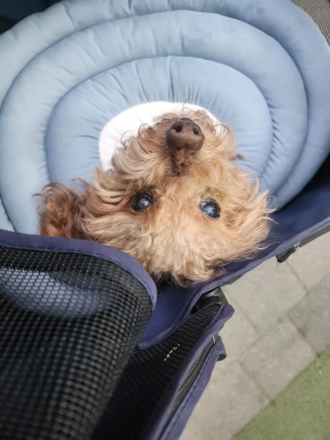 스스로 걷지 못하게 된 모카는 개모차(강아지 유모차)에 태우거나 품에 안고 걸어야만 했다.