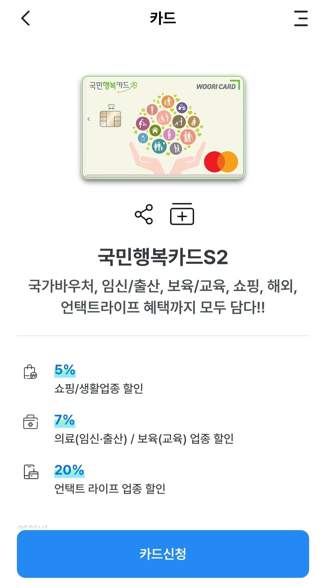 국민행복카드는 신용카드 또는 체크카드 중 선택할 수 있으며, 카드사마다 조건이나 혜택이 조금씩 다르다.