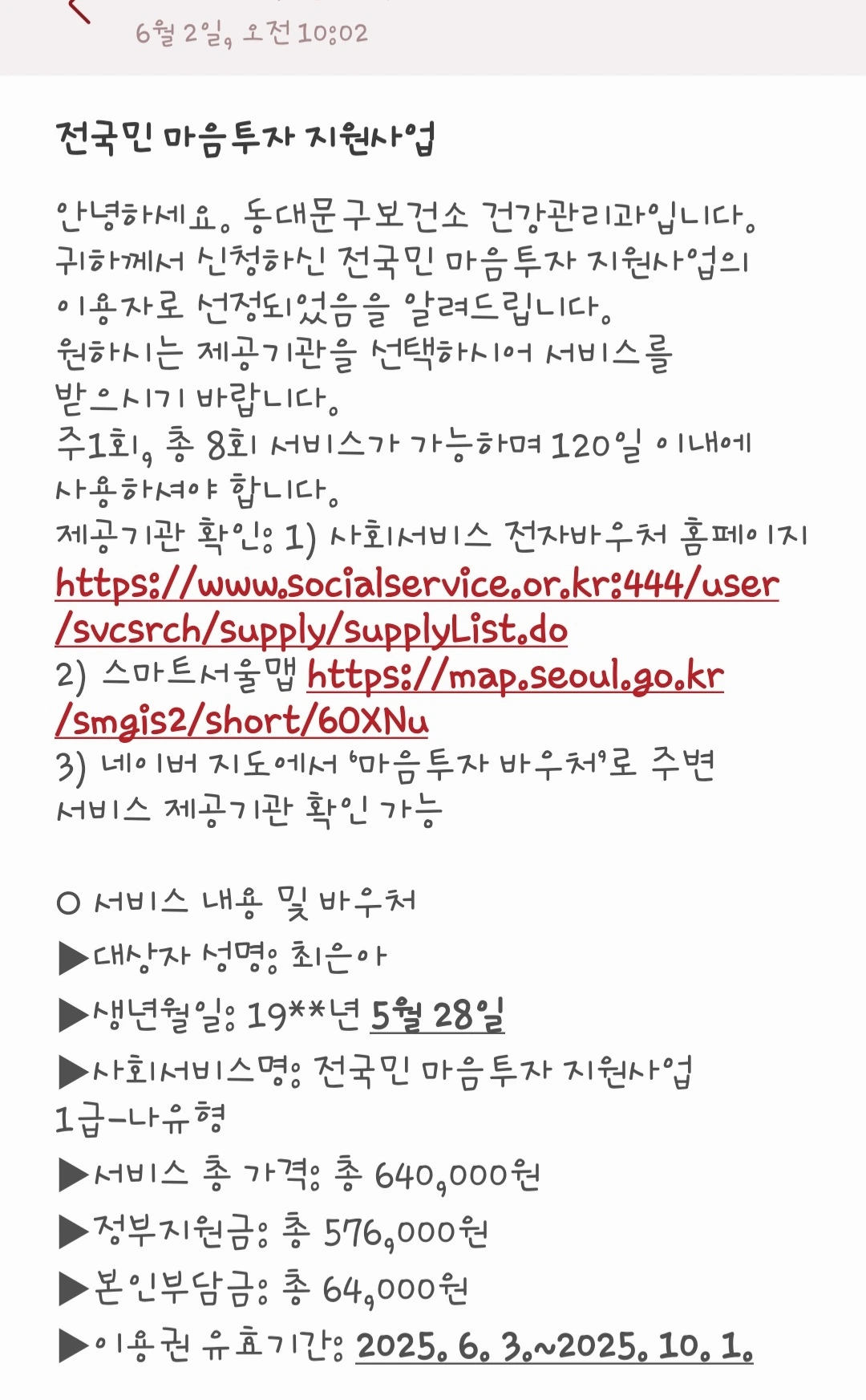 '복지로' 앱을 통해 마음투자 지원사업을 신청했고, 약 1주일 후에 승인을 받았다.