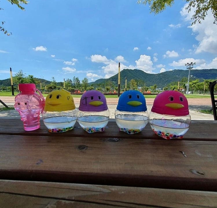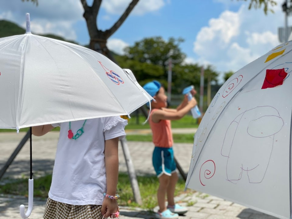 우린 순조롭게 그림책 놀이를 진행하였다. 어른 셋, 아이 넷이 충분히 앉고도 남을 정자에 옹기종기 모여 책을 함께 읽으며, 모기기피제를 만들고 우산을 만들었다. 우산을 만들고 나서는 분무기에 물을 담아 비가 내리는 연출을 하였는데, 아이들이 엄청 좋아라 했다. 미리 준비해온 주먹밥과 소시지, 옥수수, 과자, 음료를 먹으면서 본격적으로 뛰어놀기 시작했다. 무더운 날씨 탓인지 다행히(?) 공원에 온 사람들이 없었고(지나고 보니 정말 무모한 활동이었던 것 같다), 아이들은 잠시 마스크를 벗고 망아지 마냥 이리저리 뛰어다녔다.