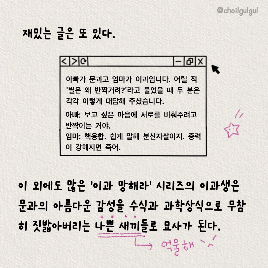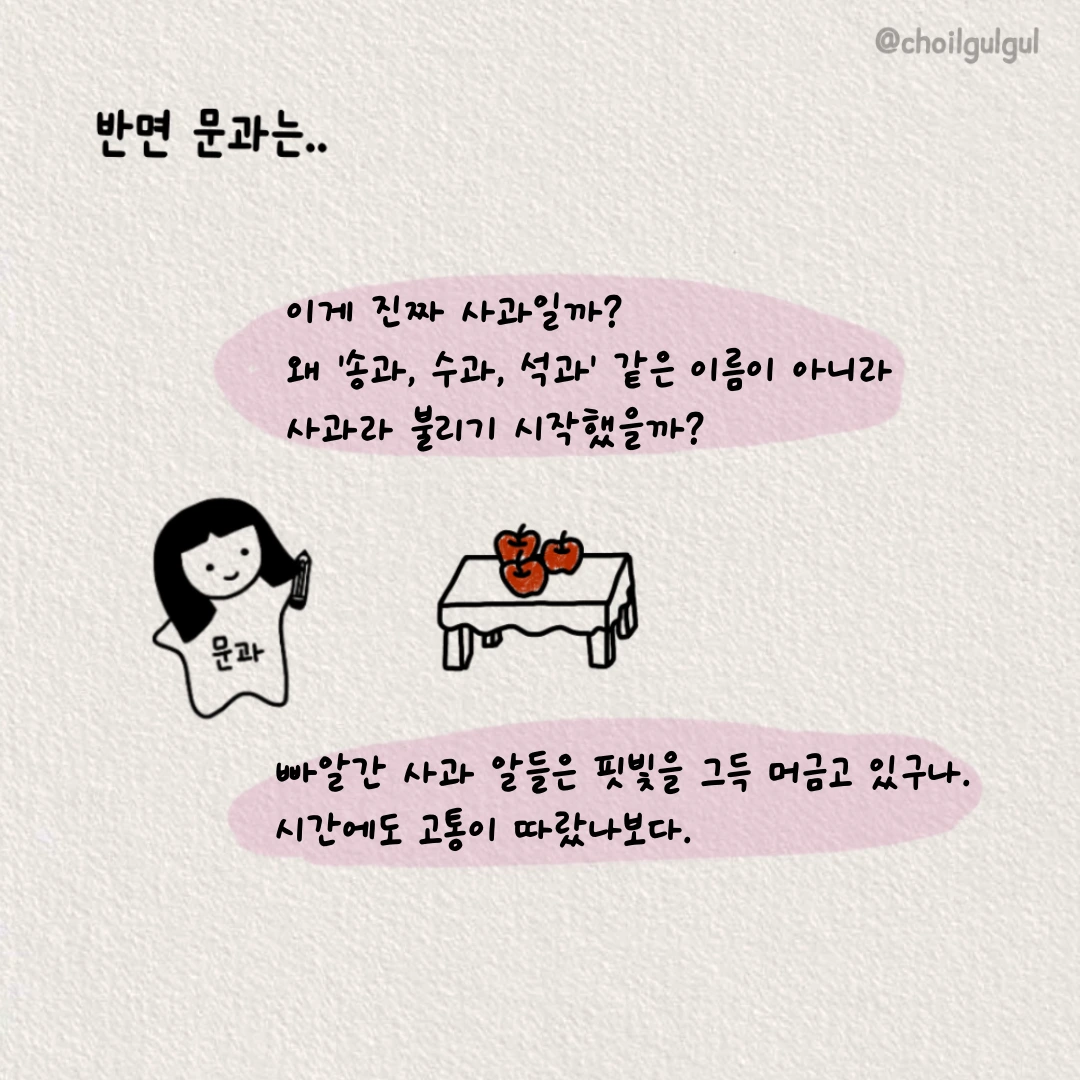 #하이브리드이과생 #이과 #문과 #예체능 #이과망해라 #문송합니다 #진로고민 #진로결정 #고등학생 #대학생 #이과툰 #최굴굴 #인스타툰 #이과의에세이 #브런치작가#인생툰 #요시타케신스케 #이게정말사과일까 #문과망해라 #농담 #부러우면지는거다