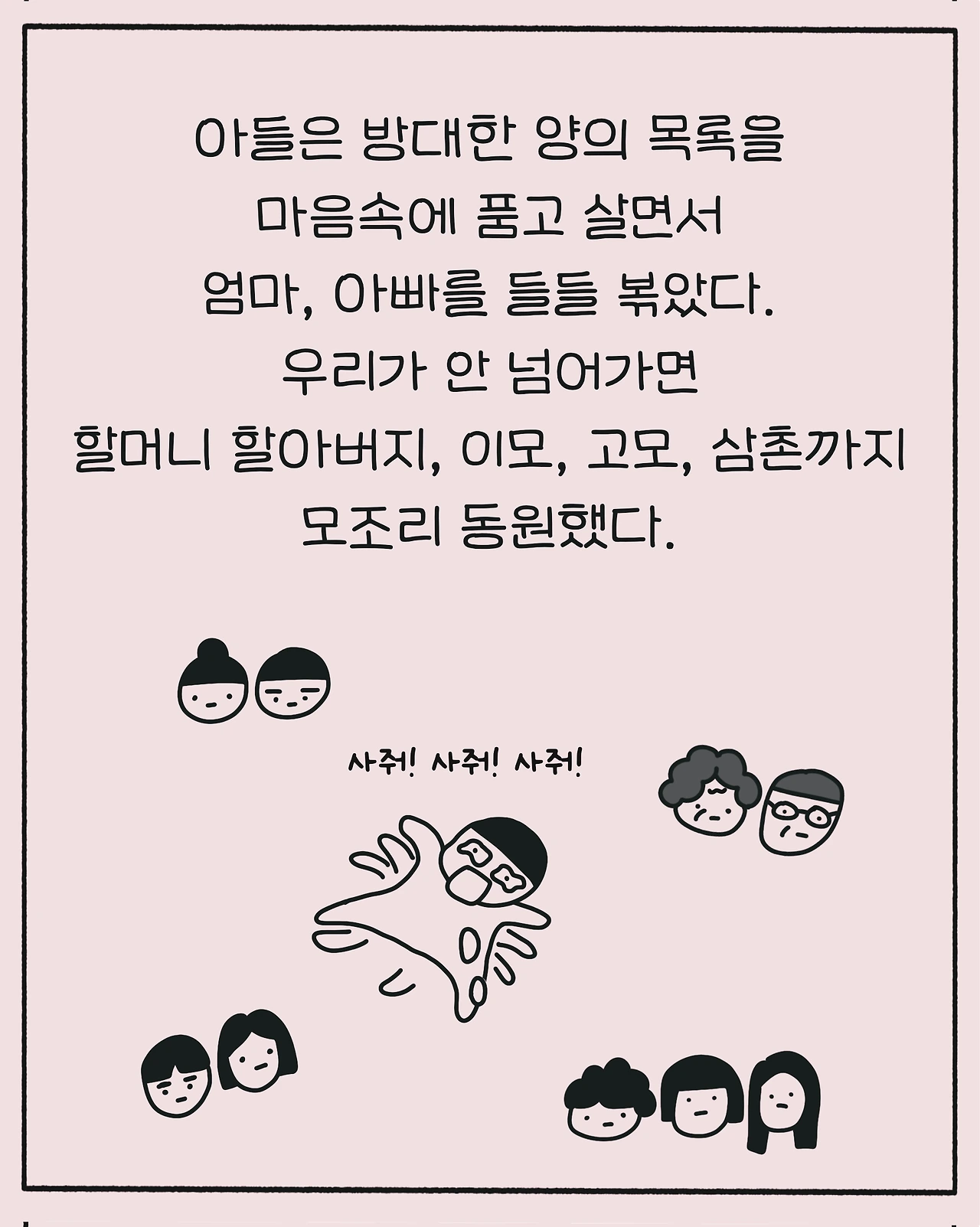 우리가 안 넘어가면 할머니 할아버지, 이모, 고모, 삼촌까지 모조리 동원했다.
