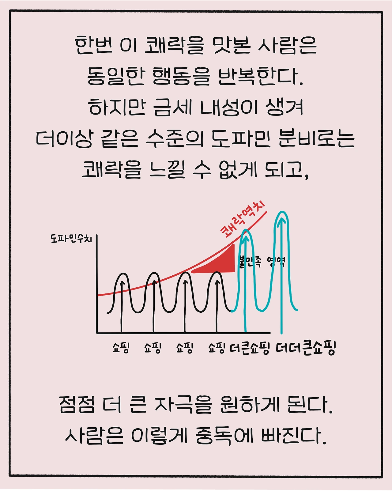 하지만 금세 내성이 생겨 더 이상 같은 수준의 도파민으로는 쾌락을 느낄 수 없게 되고