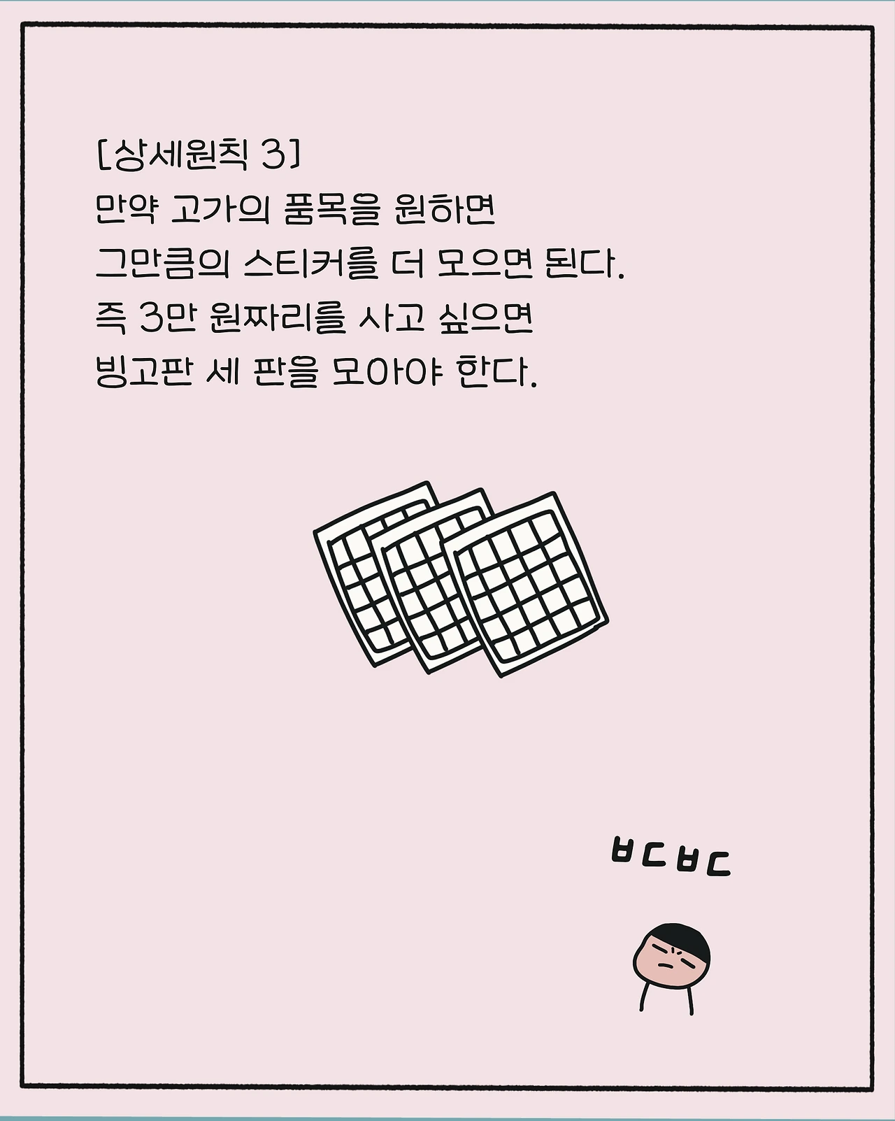 만약 고가의 품목을 원하면 그만큼의 스티커를 더 모으면 된다. 즉 3만 원짜리를 사고 싶으면 빙고판 세 판을 모아야 한다.