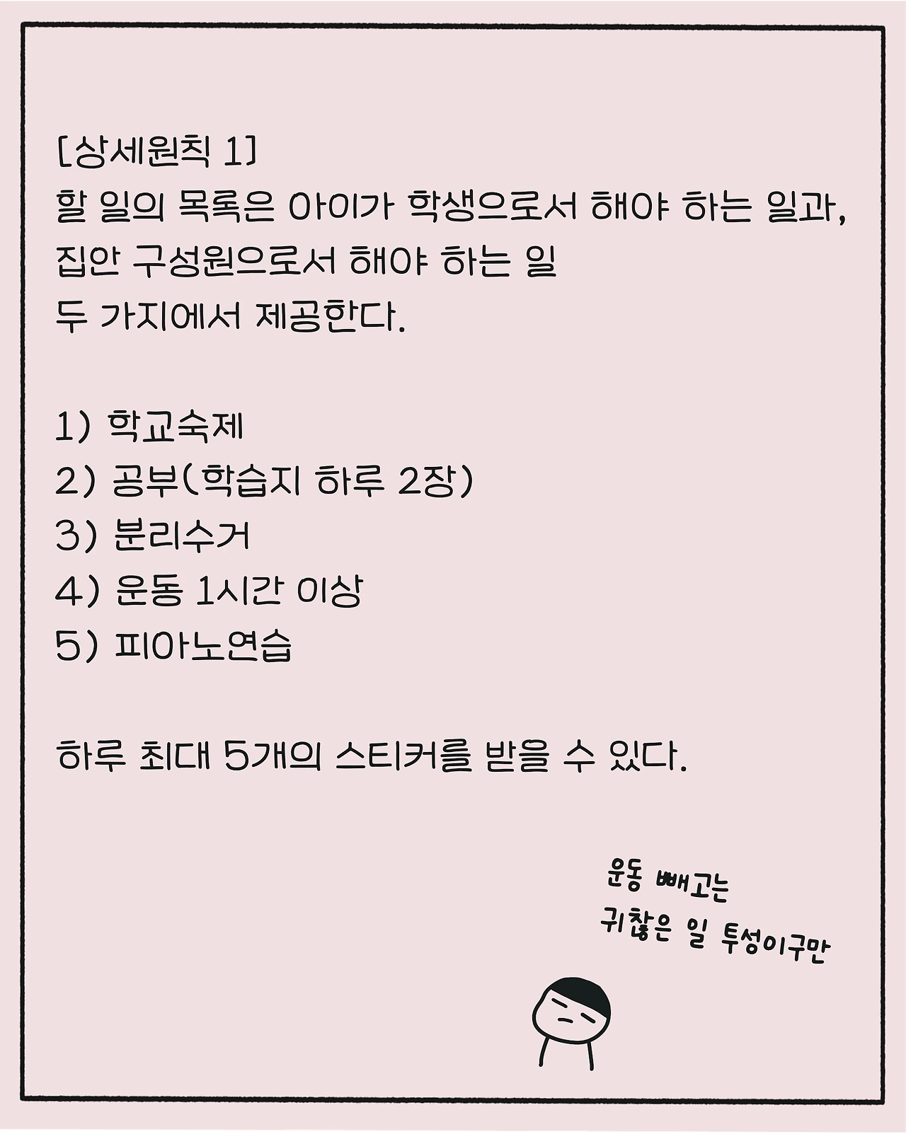 할 일의 목록은 아이가 학생으로서 해야 하는 일과 집안 구성원으로서 해야 하는 일 두 가지에서 제공한다.