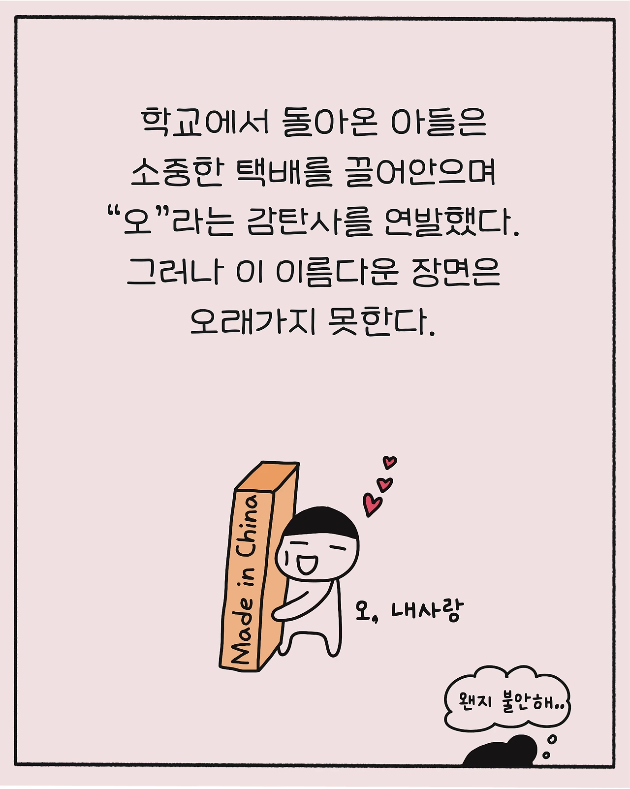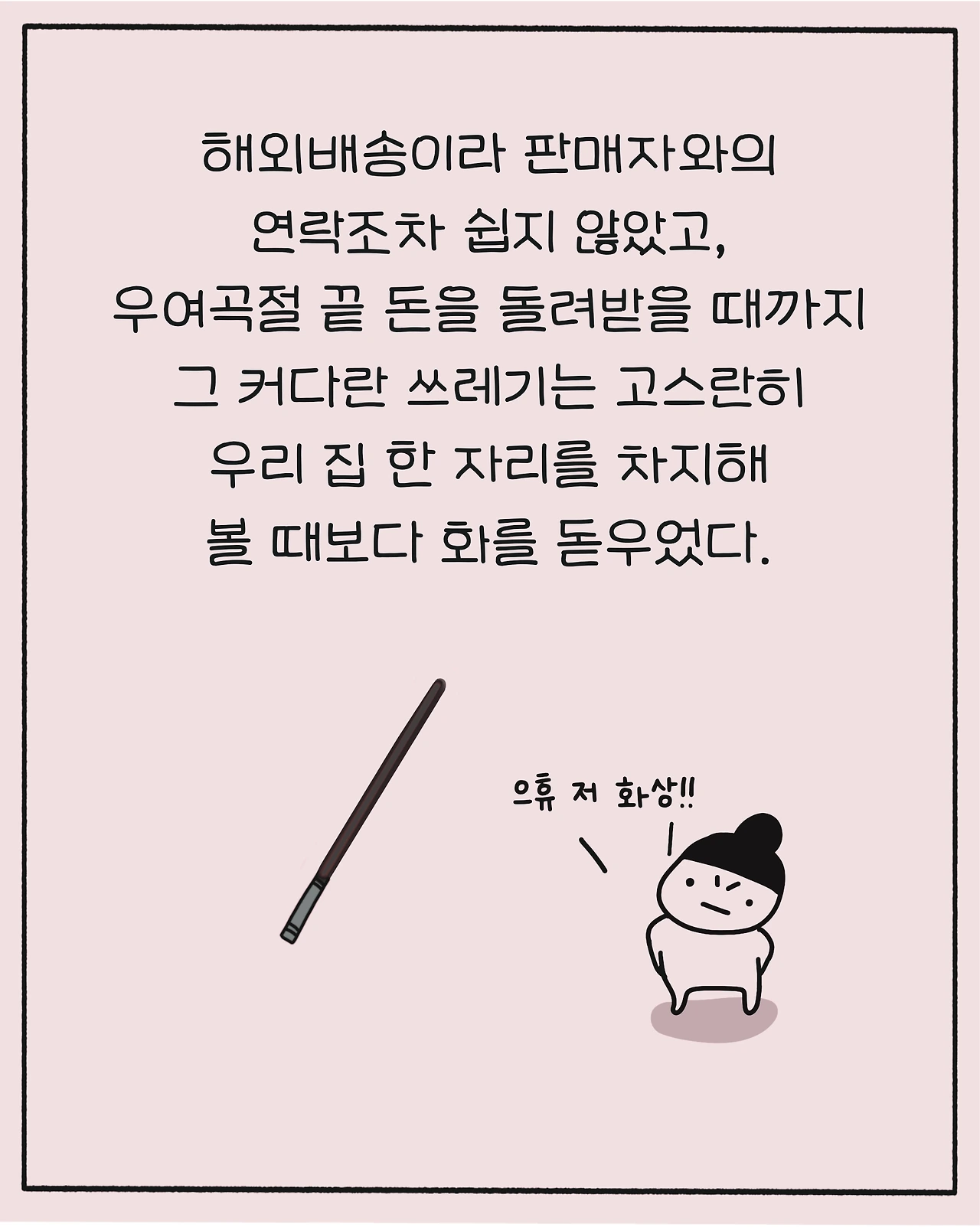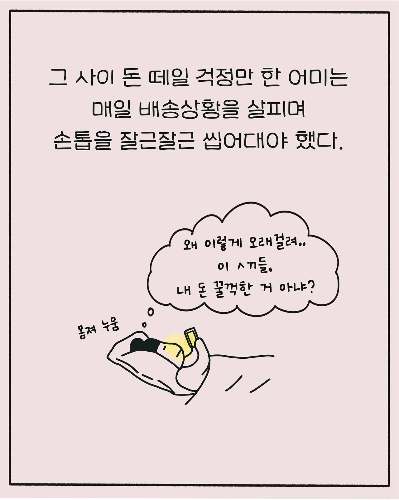그 사이 돈 떼일 걱정만 한 어미는 매일 배송상황을 살피며 손톱을 잘근잘근 씹어대야 했다.