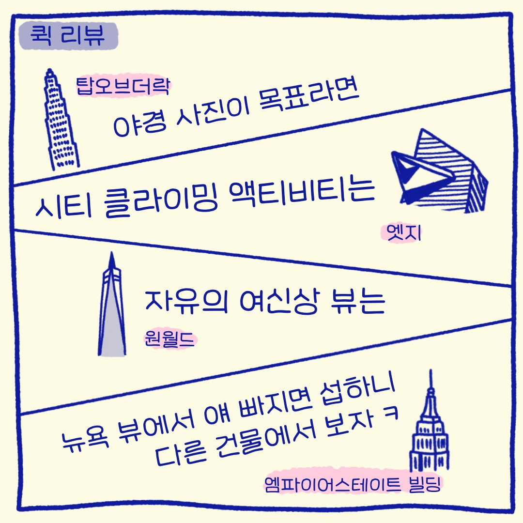 #뉴욕전망대 #뉴욕여행 #아이와미국여행 #아이와뉴욕여행 #써밋원 #벤더빌트 #엣지 #탑오브더락 #엣지 #엠파이어스테이트빌딩 #원월드 #뉴욕전망대비교 #뉴욕전망대추천 #여행툰 #여행일기 #미국여행정보 #여행정보 #해외여행