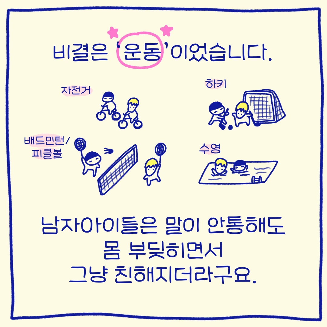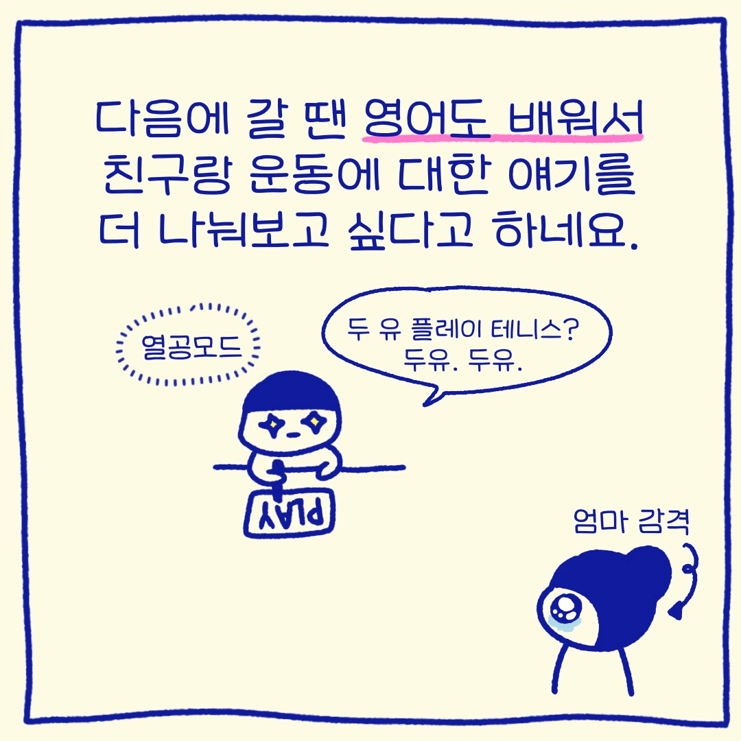 공부가 아닌 운동과 플레이데이트로 아이들이 바빴고 덕분에 우리 아들도 끼어 놀기 너무 좋았거든요. 운동을 잘하니 영어 좀 못해도 같이 노는데 지장이 없더라고요.