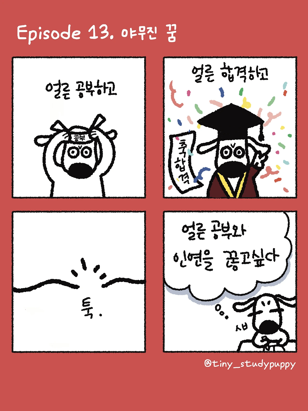 #시험 #시험기간 #열공 #공부스타그램 #시험공부 #공부공감 #공부툰 #공부강아지티니 #네컷툰 #브런치툰 #공부자극 #유머툰 #공부일기 #공부 #멍공일기 #공부싫어 #공부끝 #공부는끝이없다 #야무진꿈