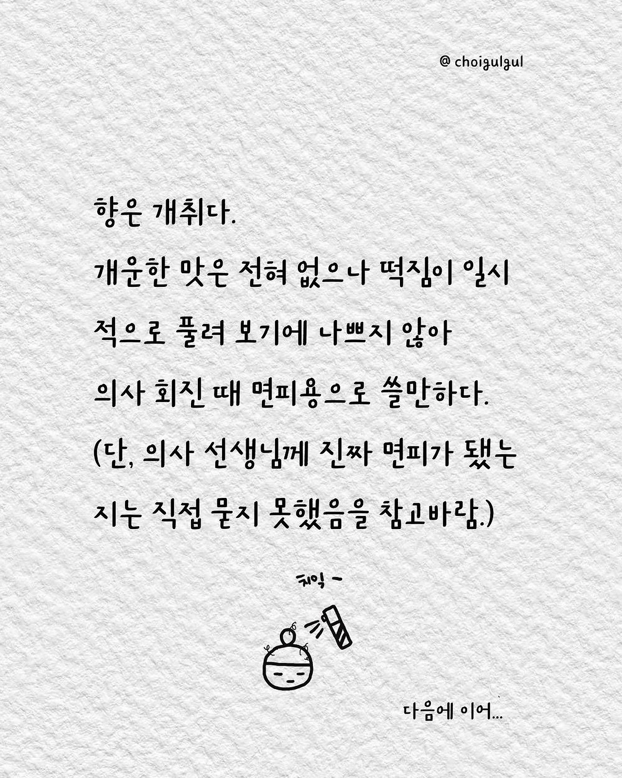 한의사이자 일러스트레이터. 꼭꼭 씹어 먹듯 읽어야 재밌는 그림 에세이를 씁니다.