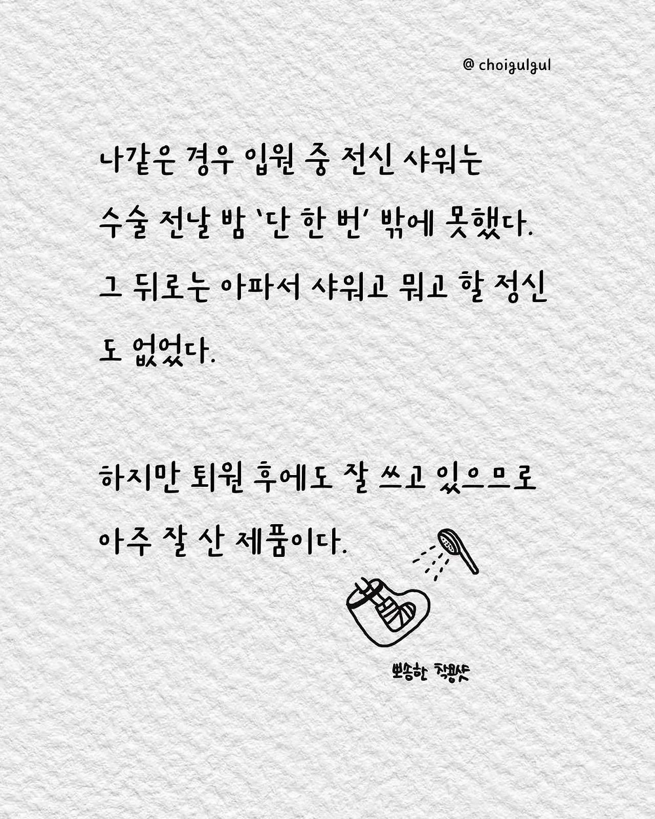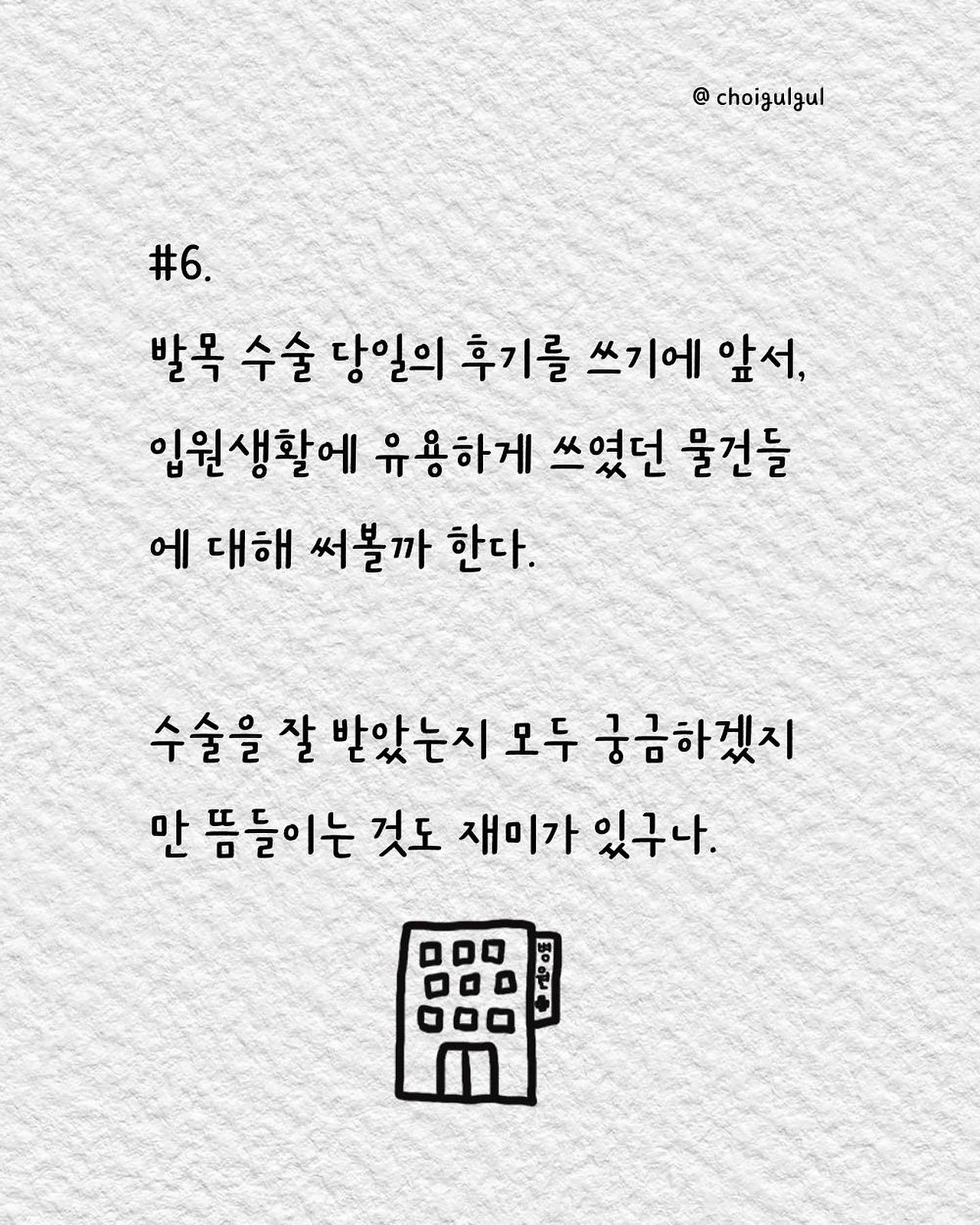 #입원필수품 #입원준비물 #입원선물 #환자 #골절 #발목골절 #어쩌다골절 #최굴굴 #인스타툰 #에세이 #골절에세이 #골절일기 #그림일기 #브런치 #글쓰기