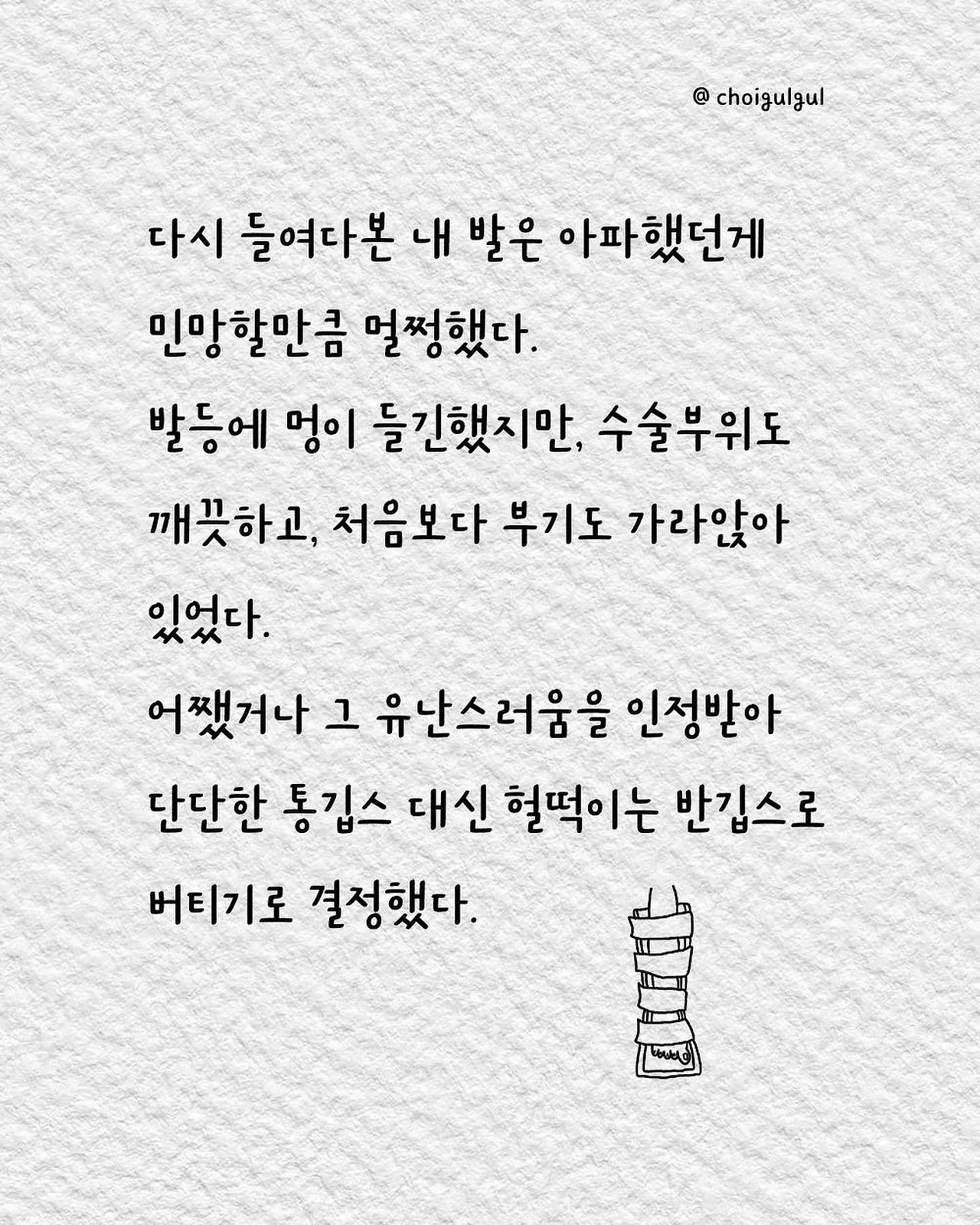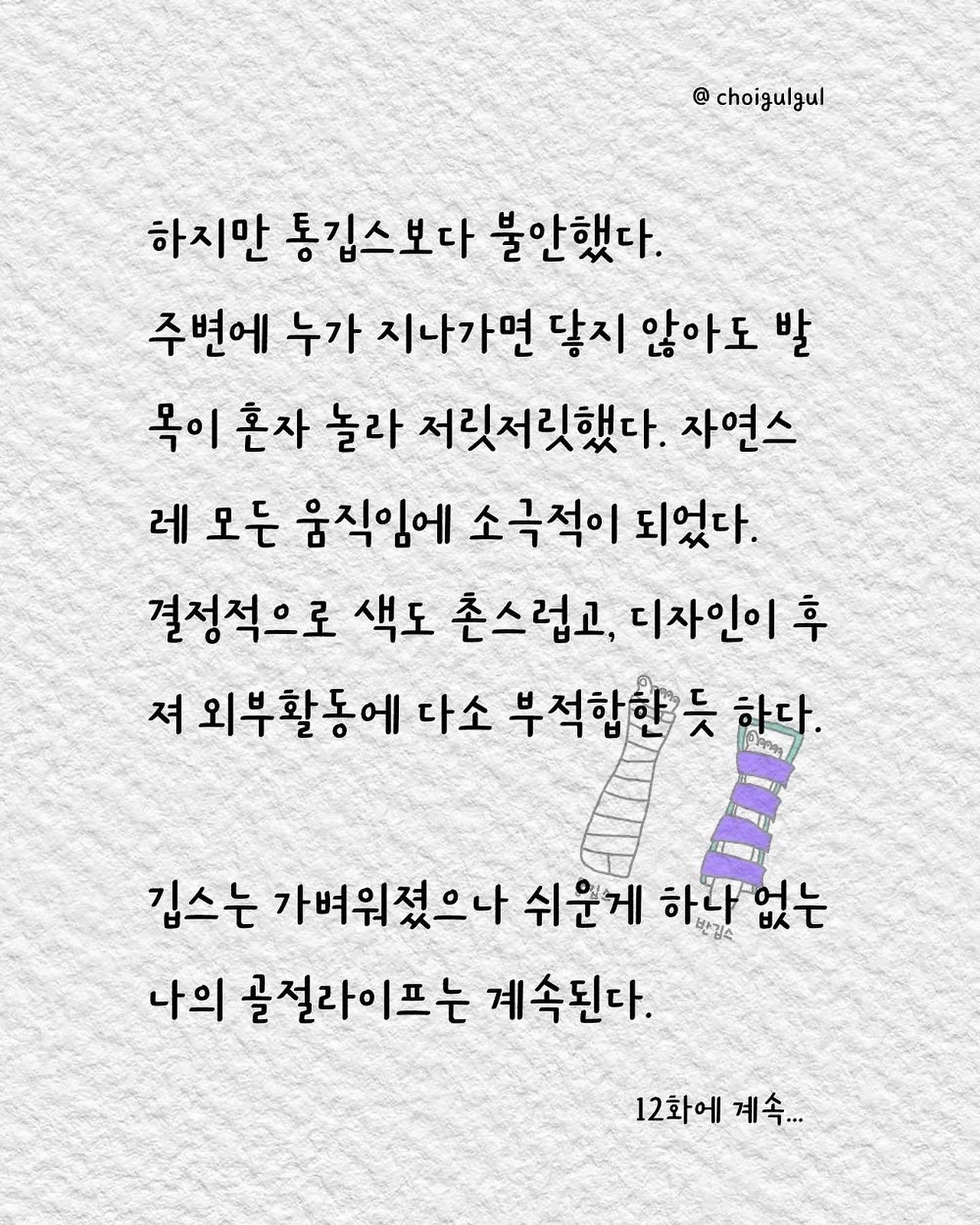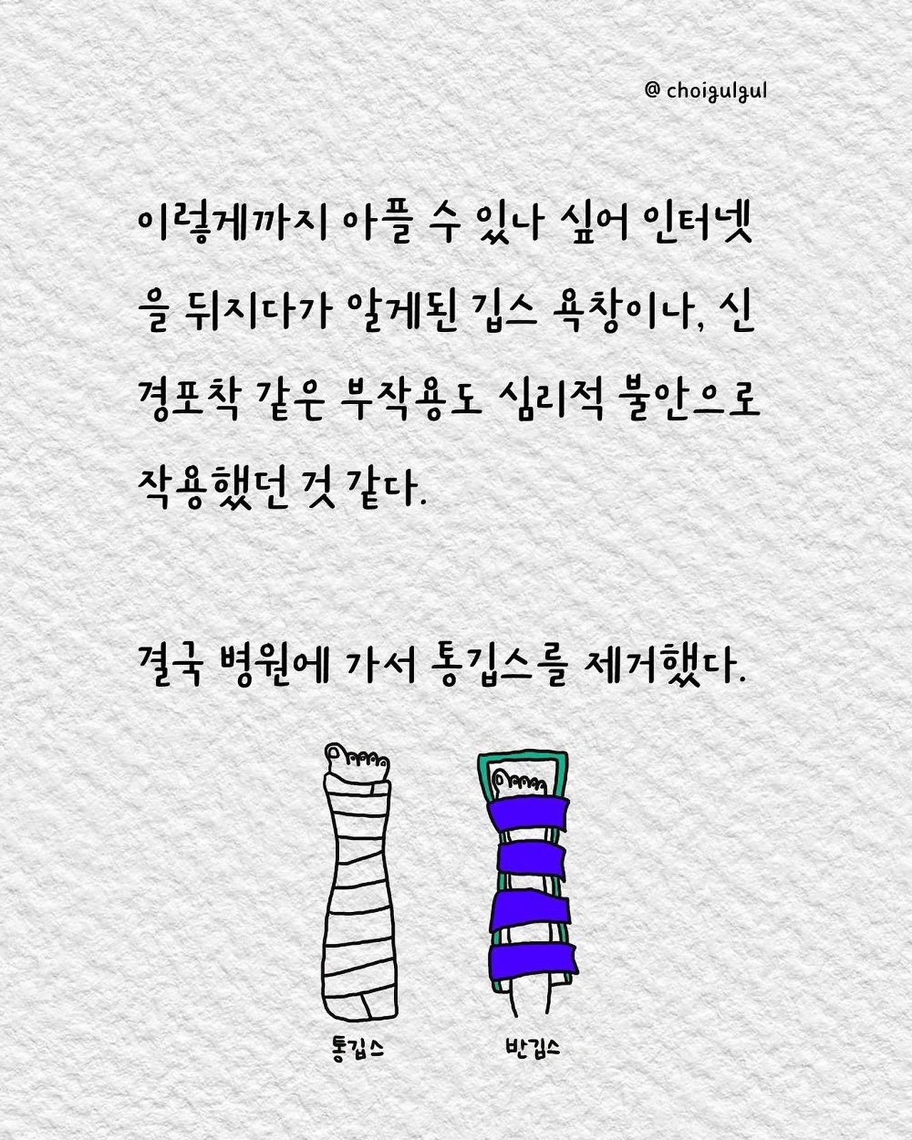 #깁스 #통깁스 #반깁스 #환자 #이프지말자 #깁스캐릭터 #골절 #발목골절 #어쩌다골절 #최굴굴 #인스타툰 #에세이 #병원 #환자 #수술 #입원 #레지던트 #의사 #간호사 #간병인 #보호자 #석고실 #석고기사 #장단점 #브런치 #글쓰기
