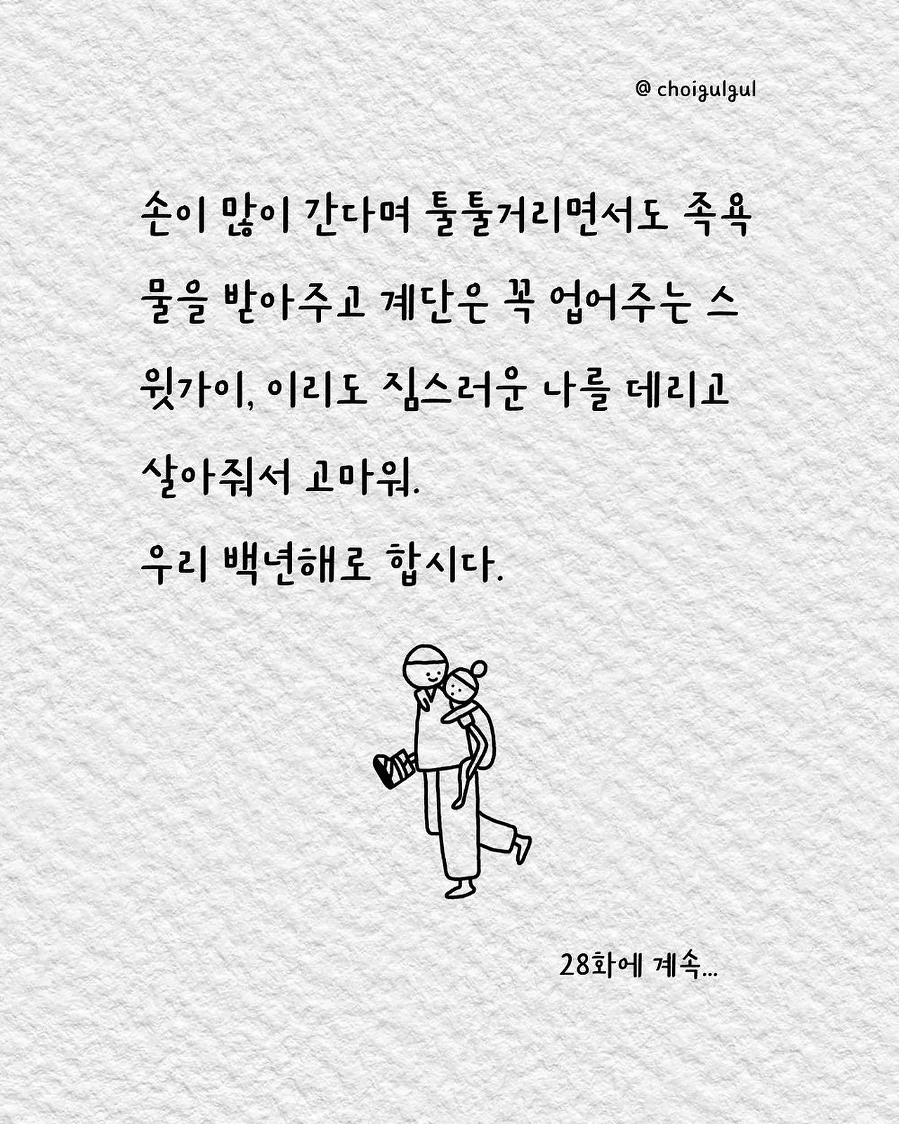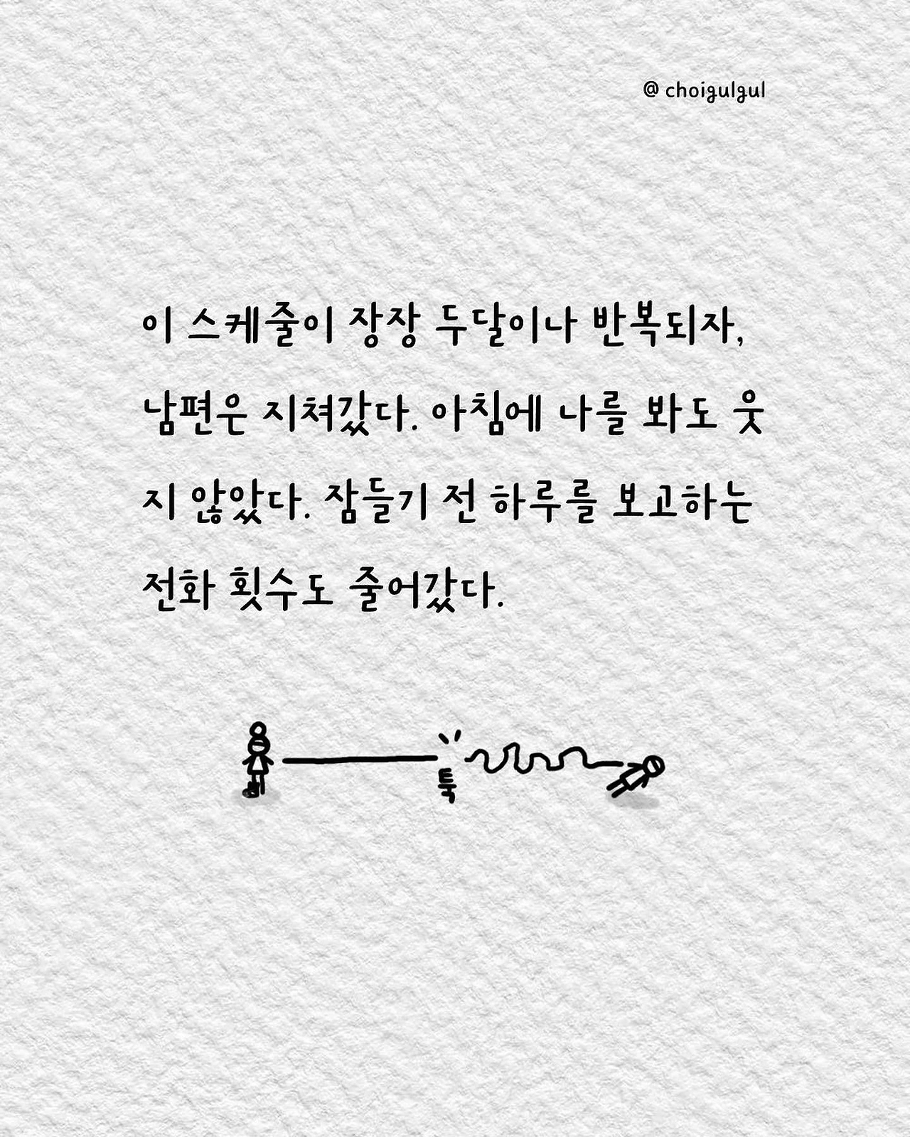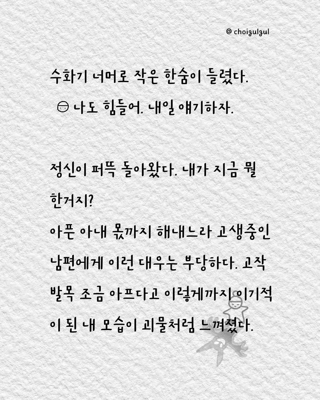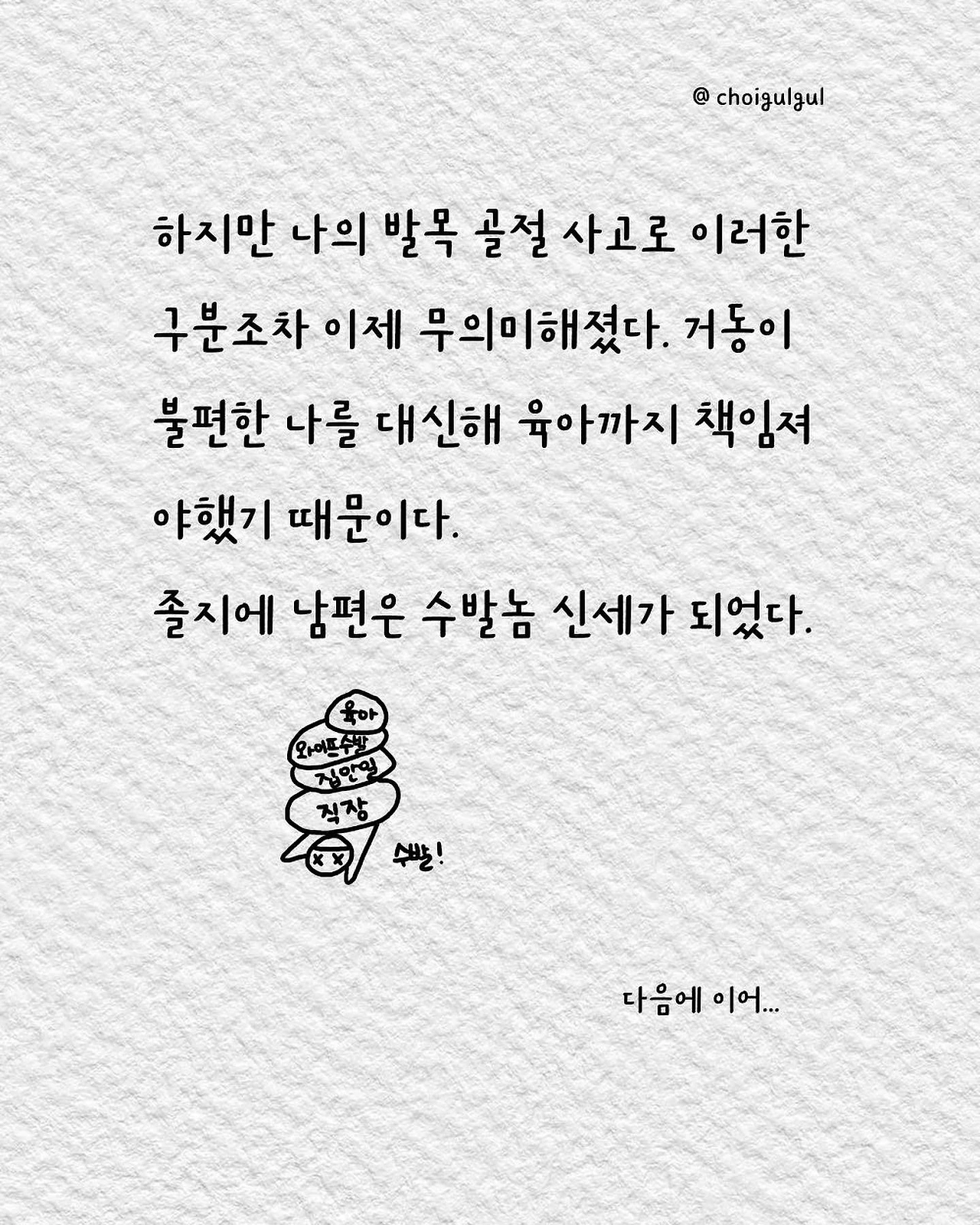#부부싸움 #아내 #와이프 #진상 #남편 #수발놈 #발음주의 #위로 #가사노동분담 #육아 #가사일 #집안일 #싸움 #칼로물베기 #백년해로 #어쩌다골절 #최굴굴 #인스타툰 #공감글 #에세이 #부부 #사과 #사과는애플워치 #사랑해 #미안해 #고마워