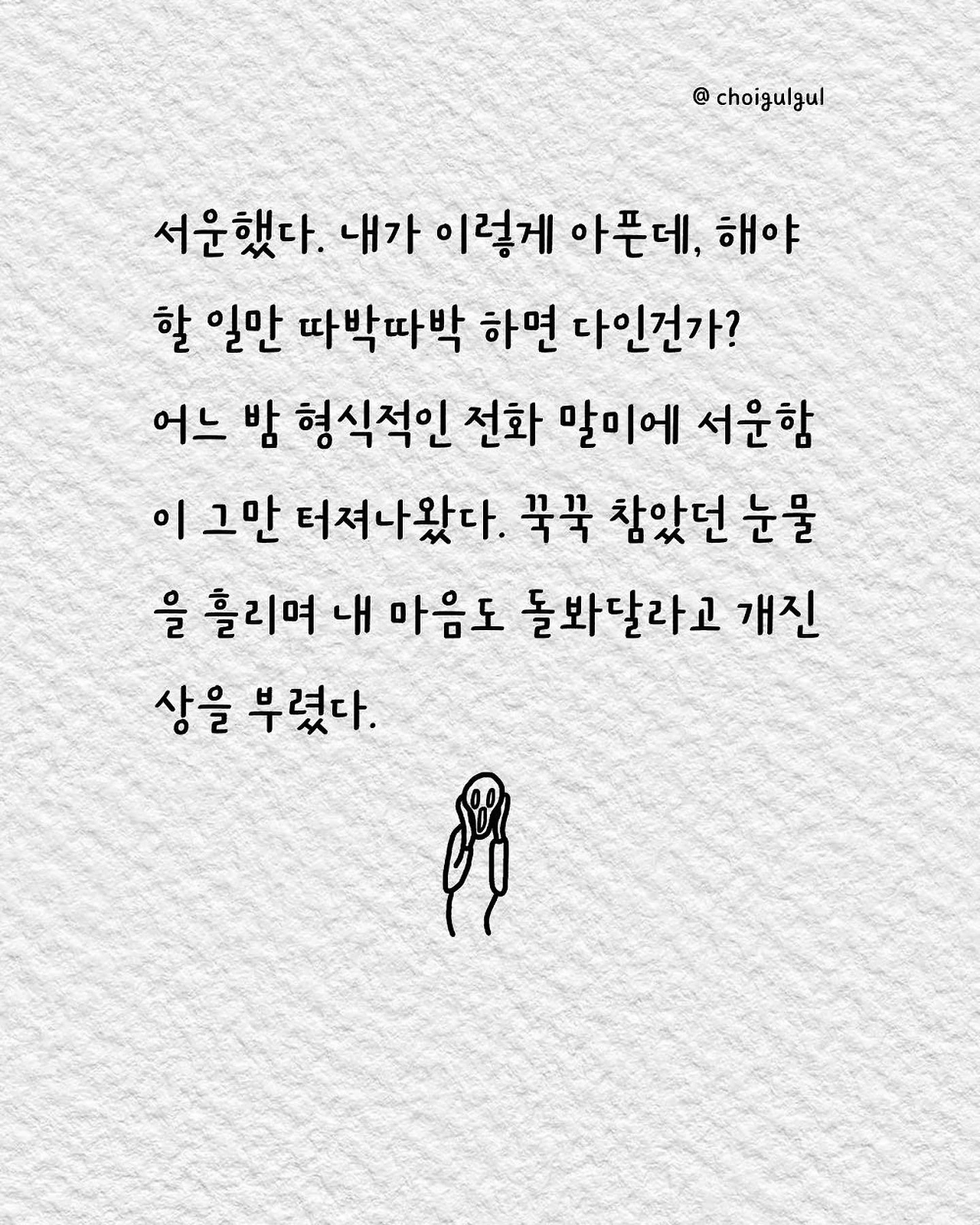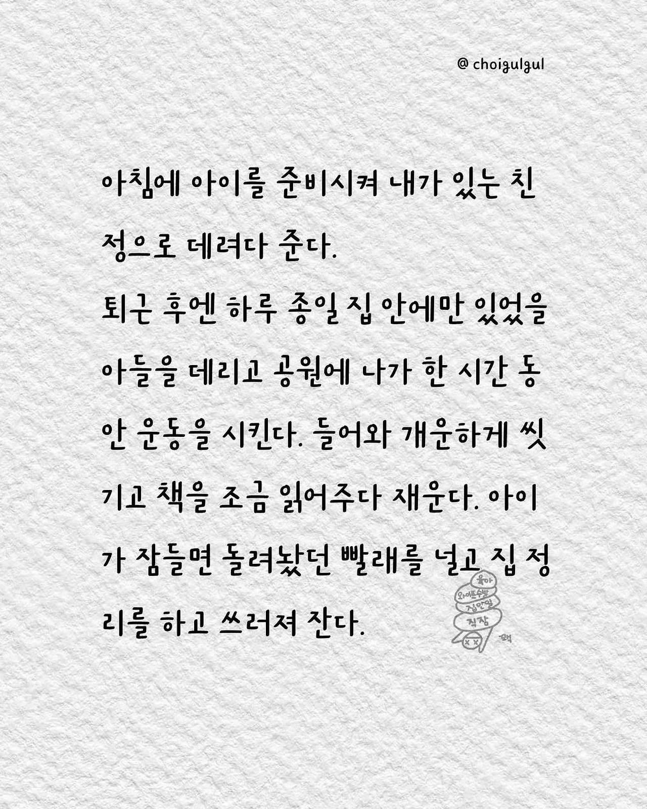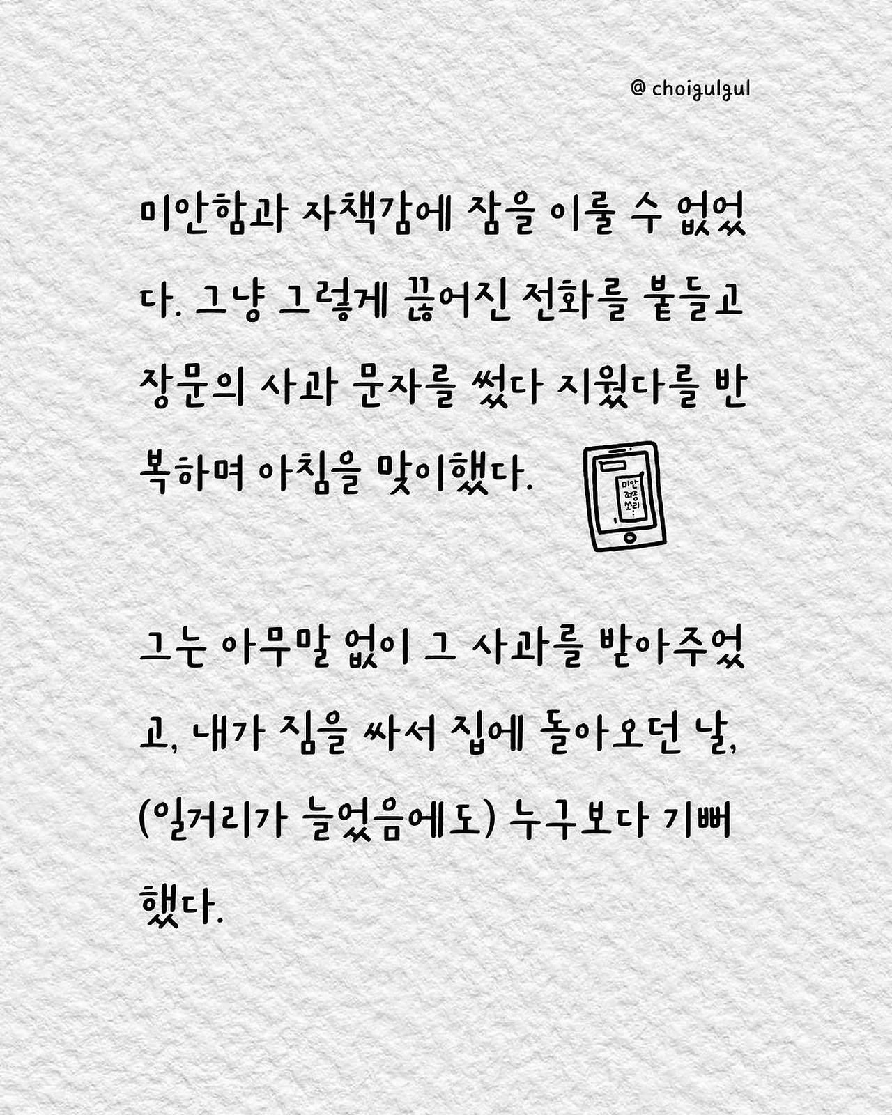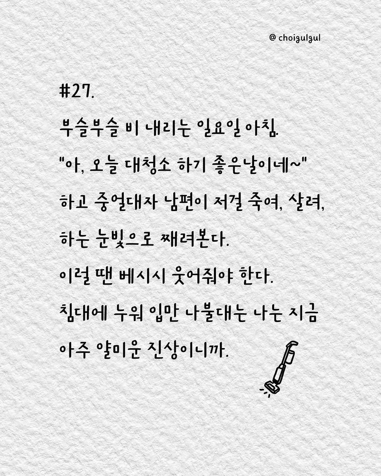 #부부싸움 #아내 #와이프 #진상 #남편 #수발놈 #발음주의 #위로 #가사노동분담 #육아 #가사일 #집안일 #싸움 #칼로물베기 #백년해로 #어쩌다골절 #최굴굴 #인스타툰 #공감글 #에세이 #부부 #사과 #사과는애플워치 #사랑해 #미안해 #고마워