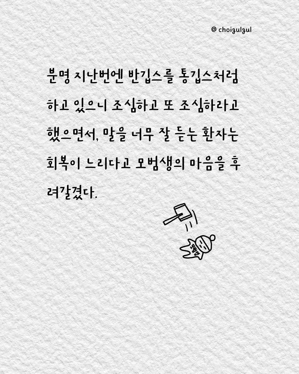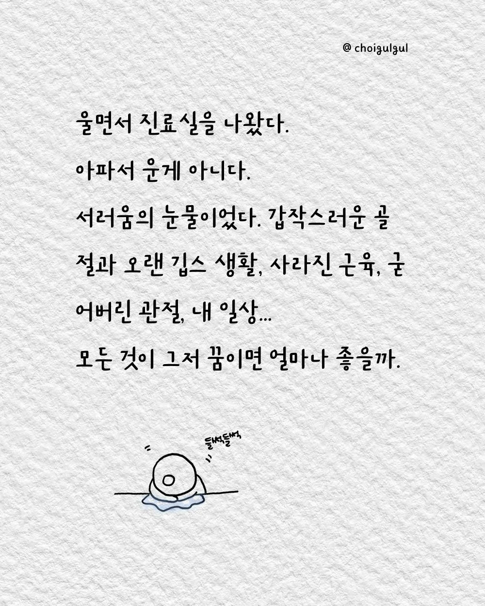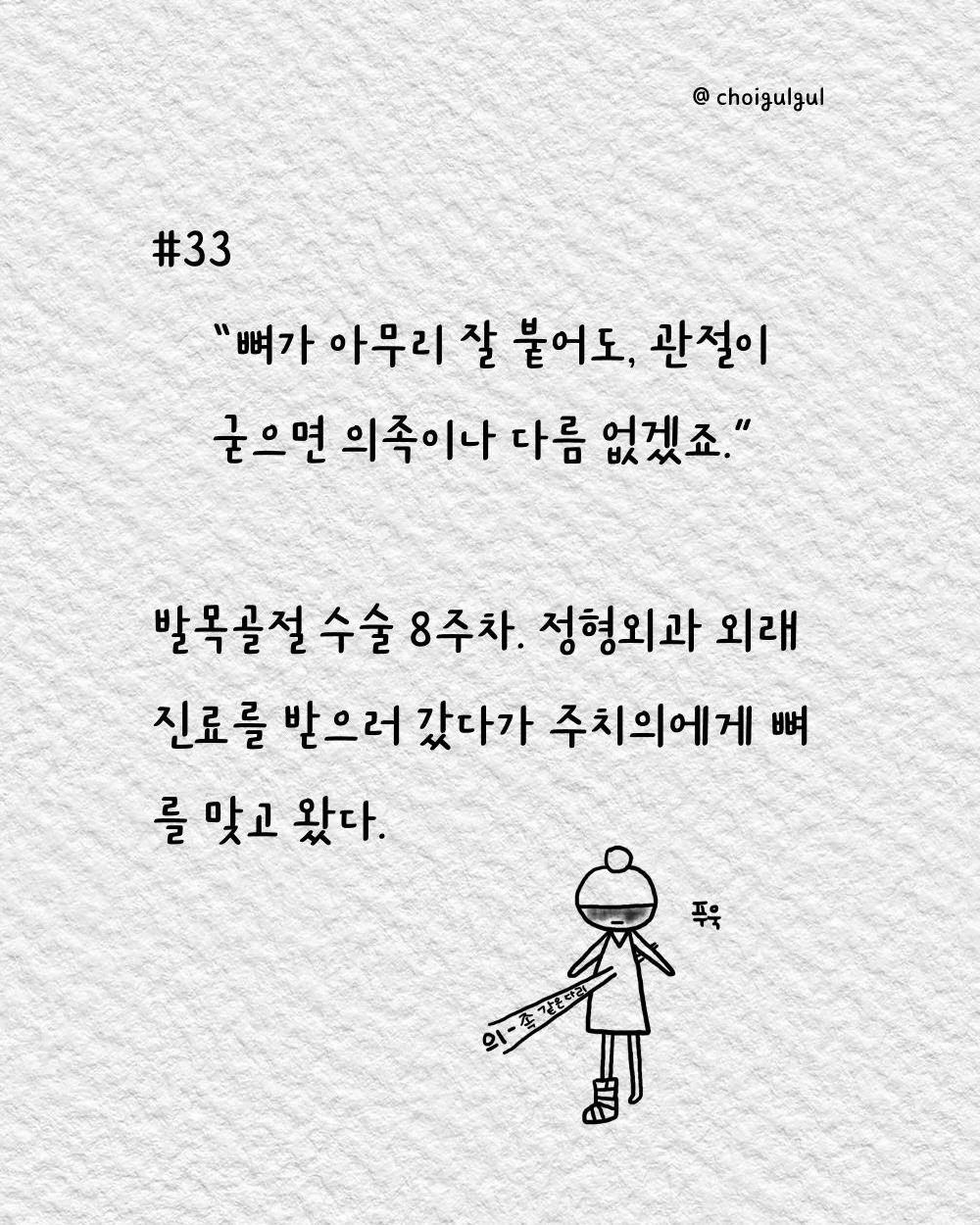 #정형외과 #진료 #외래 #교수님 #거말이너무심한거아니오 #재활 #깁스 #탈깁스 #깁스탈거 #깁스해체 #심란 #골절 #발목골절 #골절툰 #최굴굴 #인스타툰 #어쩌다골절 #그림에세이 #브런치작가 #8주 #속상해 #걷자 #운동하자 #도수치료