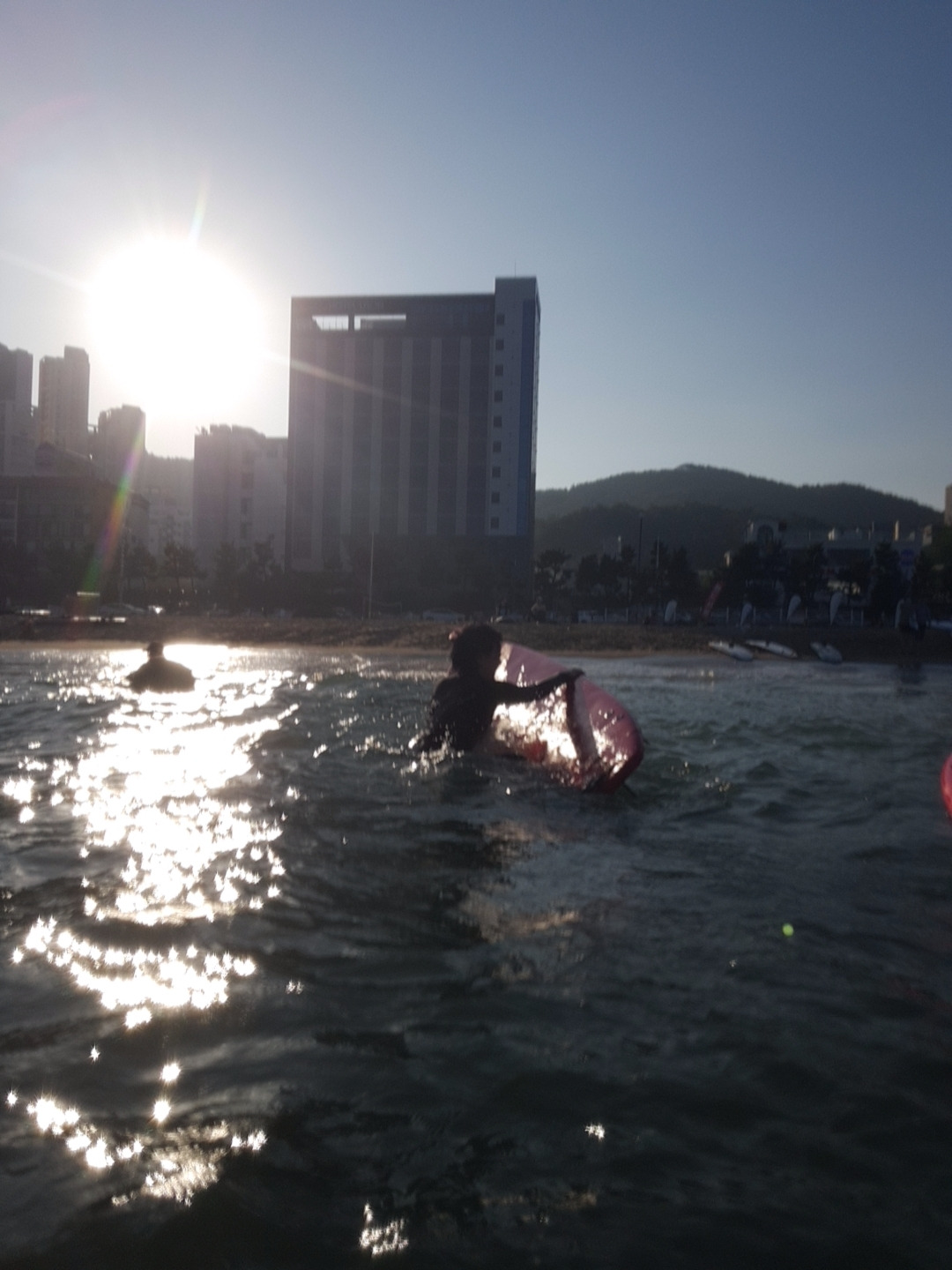 어둠의 세력들은 순조로이 서핑 강습을 받았다. 오후 6시가 지나니 해수욕하는 사람들이 빠지고 서핑을 하는 사람들만 남았다. 혹시 그 광경을 본 적이 있는가. 구글에 '서핑'이라고 치면 뜨는, 웃통을 벗은 서핑 보이가 원통형 파도를 촤하악 가르는 모습과는 크게 다르다. 보드 위에 일어서는 것 이상 진도를 나가지 못한 다수의 서핑 초보들이 보드에 배를 깔고 엎드려 나뭇잎에 붙은 송충이처럼 흔들흔들 거리는 게 주된 풍경이다. 하지만 그것만으로도 굉장히 재미있기 때문에 우리는 저녁 7시까지 그러고 놀았다.