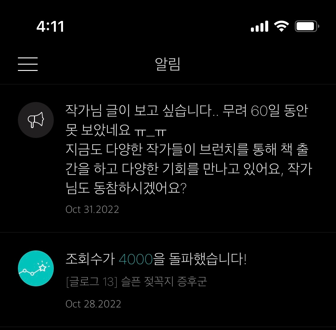 브런치에 들어오니 이런 알림이 떠있더군요. 60일이나 글을 쓰지 않았다니.. 그 와중에 슬픈 젖꼭지 증후군은 왜 조회수가 4,000이 되었을까요. 알림을 보며 놀랍고 또 믹스테리한 느낌을 받았습니다.