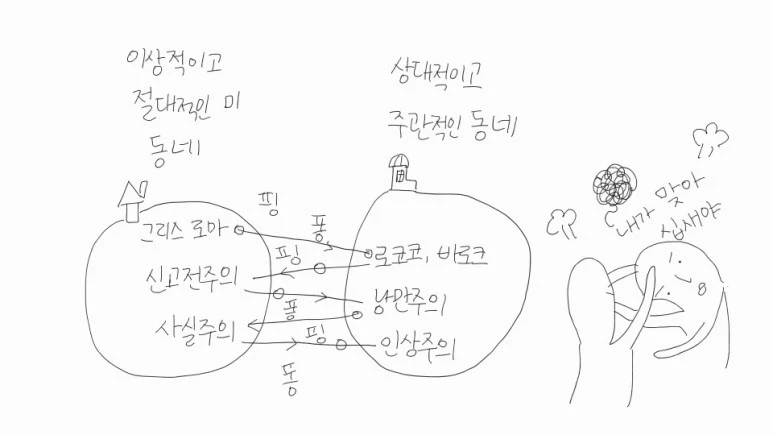 르네상스의 바로크, 로코코 미술은 그리스 로마 시대의 절대적인 미의 기준에 반기를 들며 나타났다. 이 때의 예술가들은 아름다움은 머리로 계산할 때가 아니라 감정과 주관에 따를 때 탄생한다고 생각했다. 하지만 근대로 넘어오면서 그리스 로마 시대의 이상적인 아름다움을 회복하자는 신고전주의가 등장했다. 비슷한 시기에 낭만주의가 등장했는데, 이름에서 감이 딱 오듯 주관적이고 감정적으로 표현하는 사조였다. 신고전주의와는 정반대로 볼 수 있다.