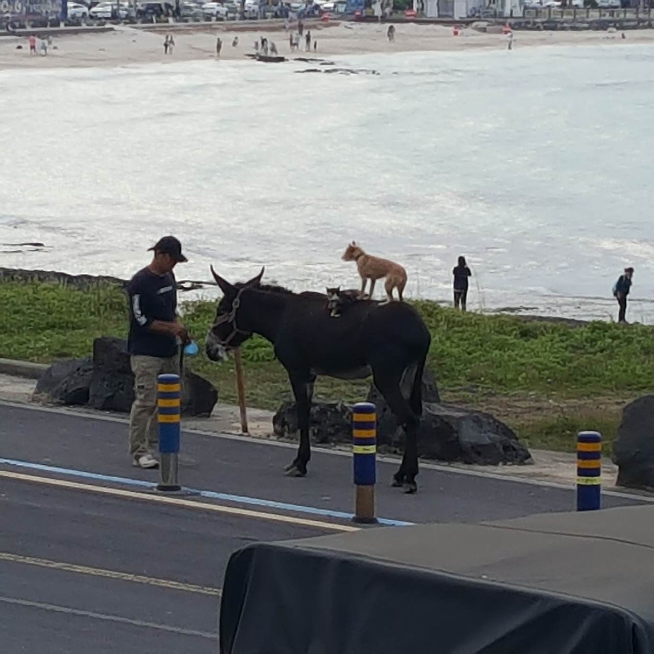 한 점 한 점 손을 벌벌 떨며 쌈을 싸는데 도로 맞은편으로 어떤 '무리'가 지나갔다. '모임'이라고 불러야 할 것 같기도 하고, 그냥 '그들'이라고 해야 할 것 같기도 했다. 그 무리는 1 인간, 1 당나귀, 1 개, 1 고양이로 구성되어 있었다. 마치 브레멘 음악대처럼 당나귀 위에 강아지와 고양이가 올라 타 있었다. 이제 어디서 닭 한 마리만 구해 오시면 될 것 같았다.
