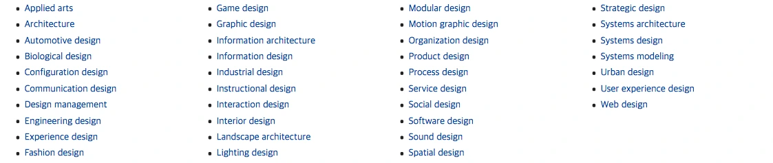 위 조합어는 모두 46개이다. 위키피디아에는 37개의 디자인 하위분야가 정리돼 있다.(그림 1) 디자인 앞뒤로 단어를 붙여 만든 조합어를 전부 끌어다 모으면 숫자는 더 늘어날 것이다. 또 지금 없는 조합어를 만들어 쓴다 해도 특별히 어색하게 느껴지진 않으리라 본다.